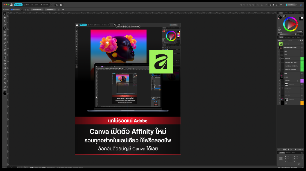 หลังจาก Canva เข้าซื้อกิจการของ Affinity ไปเมื่อช่วงต้นปีที่แล้ว ก่อนที่ล่าสุดจะปรับให้สามารถใช้งานได้ฟรี (free forever) ไม่จำเป็นต้องสมัครบริการแบบรายเดือนเพิ่มเติม ล็อกอินด้วยบัญชี Canva เพื่อใช้งานได้เลย เสียเงินเฉพาะเวลาต้องการใช้ฟีเจอร์ AI เท่านั้น โหลดมาใช้งานได้เลยตั้งแต่วันนี้บน Windows กับ Mac