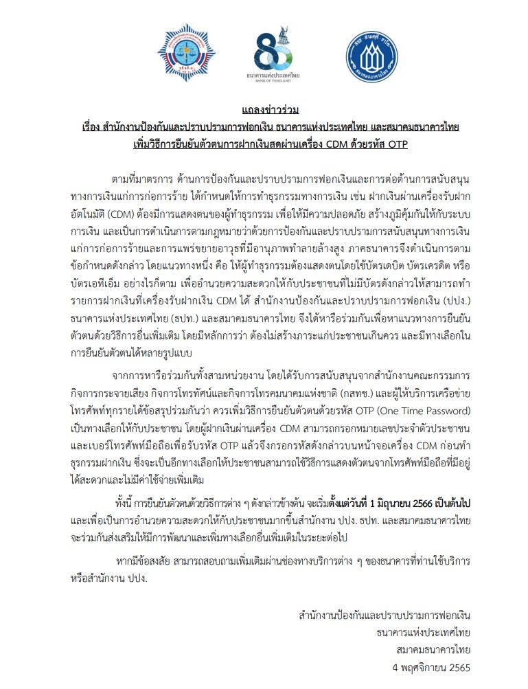 ธนาคารแห่งประเทศไทยและหน่วยงานที่เกี่ยวข้อง ประกาศเพิ่มช่องทางยืนยันตัวตนเวลาฝากเงินผ่านตู้ฝากเงินอัตโนมัติ (CDM) ด้วยรหัส OTP ทำให้ต่อไปนี้เวลาฝากเงินจะต้องใช้ 1. หมายเลขประจำตัวประชาชน 2. เบอร์โทรศัพท์มือถือที่เราพกติดตัวอยู่ เพื่อใช้ทำธุรกรรมฝากเงินกับตู้ฝาก ซึ่งจากประกาศระบุว่าจะเริ่มเปิดระบบให้ใช้ตั้งแต่วันที่ 1 มิถุนายน 2566 ครับ