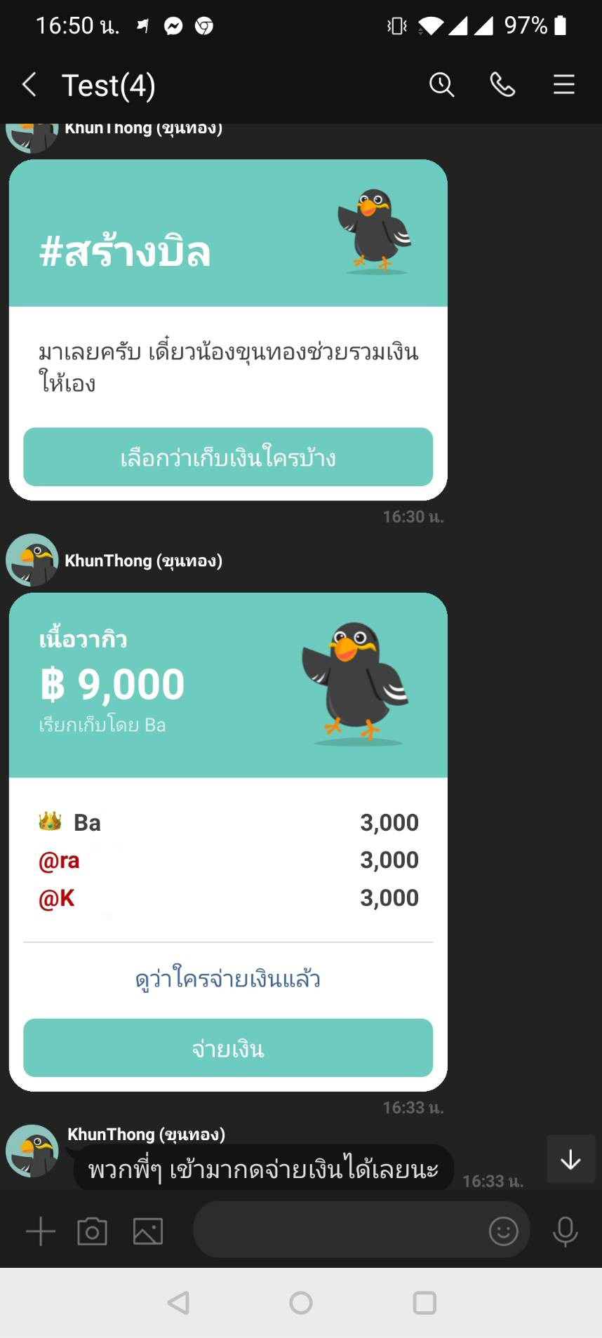 - หารจ่ายบิลแบบแฟร์ๆ เรียกเก็บเงินได้ง่ายเพียงพิมพ์ ขุนทอง และอัปรูปใบเสร็จเข้ากลุ่มแชท ให้แต่ละคนคลิกว่า กินอะไรไปบ้าง หรือกดหารบิลเท่ากันแบบแฟร์ๆ กินมากกินน้อยก็สามารถเลือกจ่ายตามจริงได้