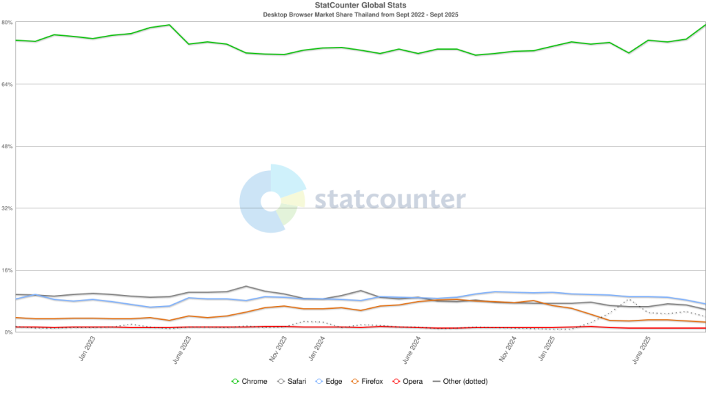 ส่วนในประเทศไทยก็มีสถิติใกล้เคียงกับตลาดโลก โดย Chrome ยังคงครองแชมป์ด้วยส่วนแบ่งสูงถึง 79.31% ตามมาด้วย Edge 7.23%, Safari 5.9%, Firefox 2.59% และ Opera 1% ซึ่งถือว่าทิ้งห่างคู่แข่งแบบไม่เห็นฝุ่น และสะท้อนพฤติกรรมผู้ใช้ในไทยที่ยังคงเลือกใช้ Chrome เป็นหลัก ไม่ต่างจากแนวโน้มระดับสากล