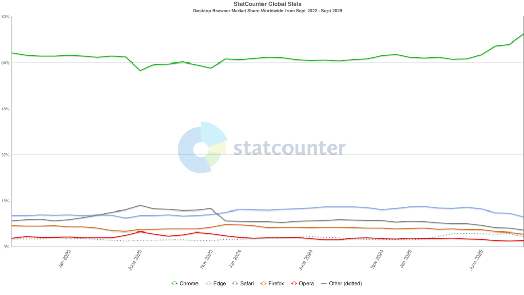StatCounter ได้เปิดเผยรายงานสัดส่วนผู้ใช้งาน Browser บน Desktop ล่าสุด (1 ตุลาคม 2025) พบว่า Google Chrome ยังคงครองบัลลังก์อันดับ 1 อย่างเหนียวแน่น ด้วยส่วนแบ่งผู้ใช้งานสูงถึง 71.86% เพิ่มขึ้นจากเดือนก่อนกว่า 2.6 จุด ถือเป็นสถิติสูงสุดใหม่ของเบราว์เซอร์นี้เลยทีเดียว ตัวเลขนี้ยิ่งตอกย้ำสถานะ “เบอร์หนึ่งแห่งเบราว์เซอร์” ที่ไม่มีใครล้มได้ง่าย ๆ แม้จะมีเสียงวิจารณ์ว่า Chrome ใช้ทรัพยากรเครื่องสูงหรือกินแรมเยอะ แต่สุดท้ายผู้ใช้ส่วนใหญ่ก็ยังเลือกมันอยู่ดี เพราะความเร็ว ความเข้ากันได้กับเว็บไซต์ต่าง ๆ และระบบซิงก์ของ Google ที่ทำให้ใช้งานต่อเนื่องได้ทุกอุปกรณ์