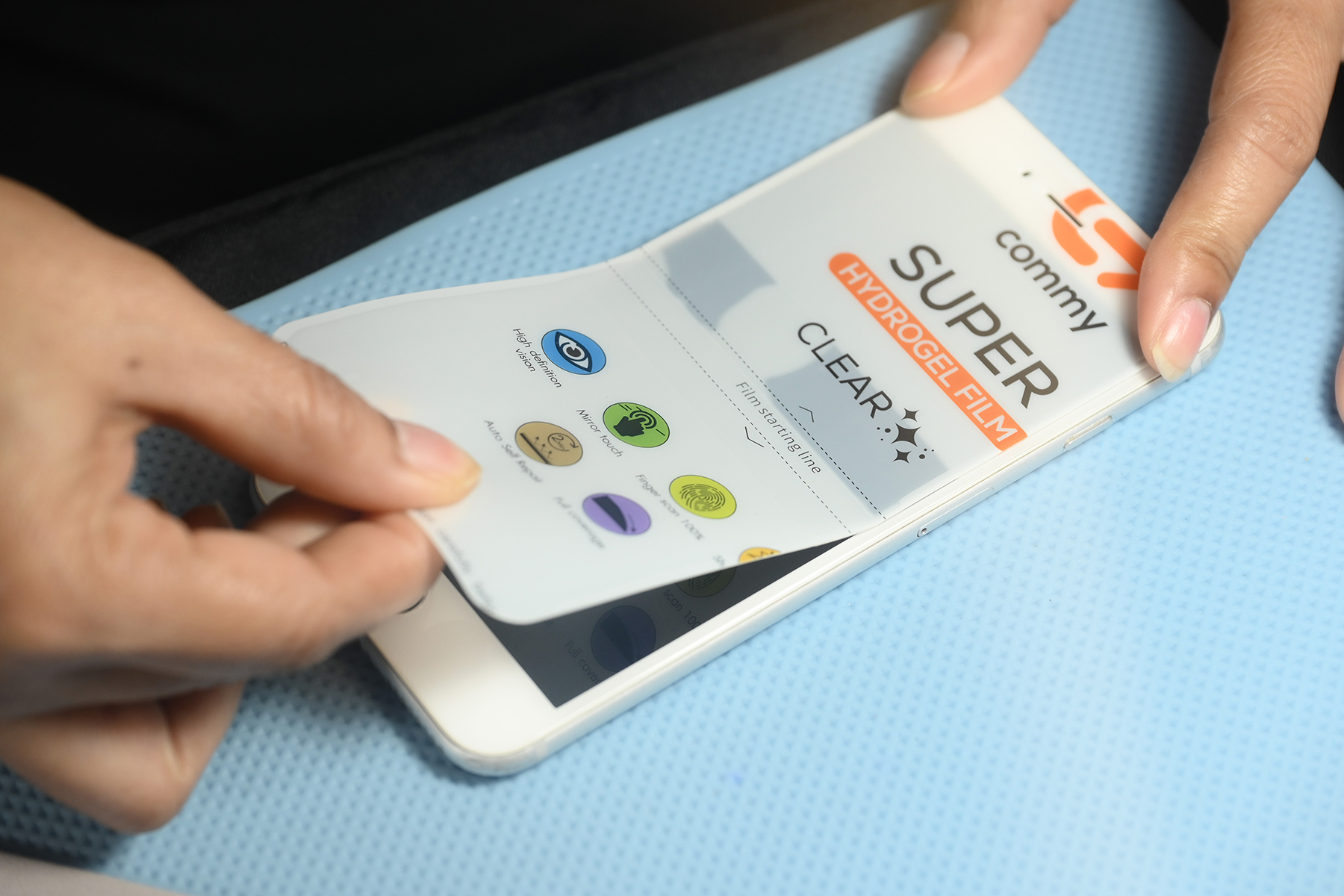 คอมมี่ ซูเปอร์ ไฮโดรเจล ฟิล์ม เป็นฟิล์มกันรอยแบบยืดหยุ่นที่มีประสิทธิภาพสูงเจ้าแรกของไทย ตัวฟิล์มมีการเพิ่มเนื้อเจลให้สูงขึ้นกว่าเจ้าอื่น ๆ พ่วงด้วยเทคโนโลยี Self-Healing ที่ช่วยให้ฟิล์มมือถือสามารถสมานรอยขีดข่วนได้เอง รอยขีดข่วนเล็ก ๆ ใช้เวลาเร็วสุดเพียง 30 วินาทีเท่านั้น ถ้ารอยลึกรอยใหญ่หน่อยก็จะใช้เวลาราว ๆ 2 นาที