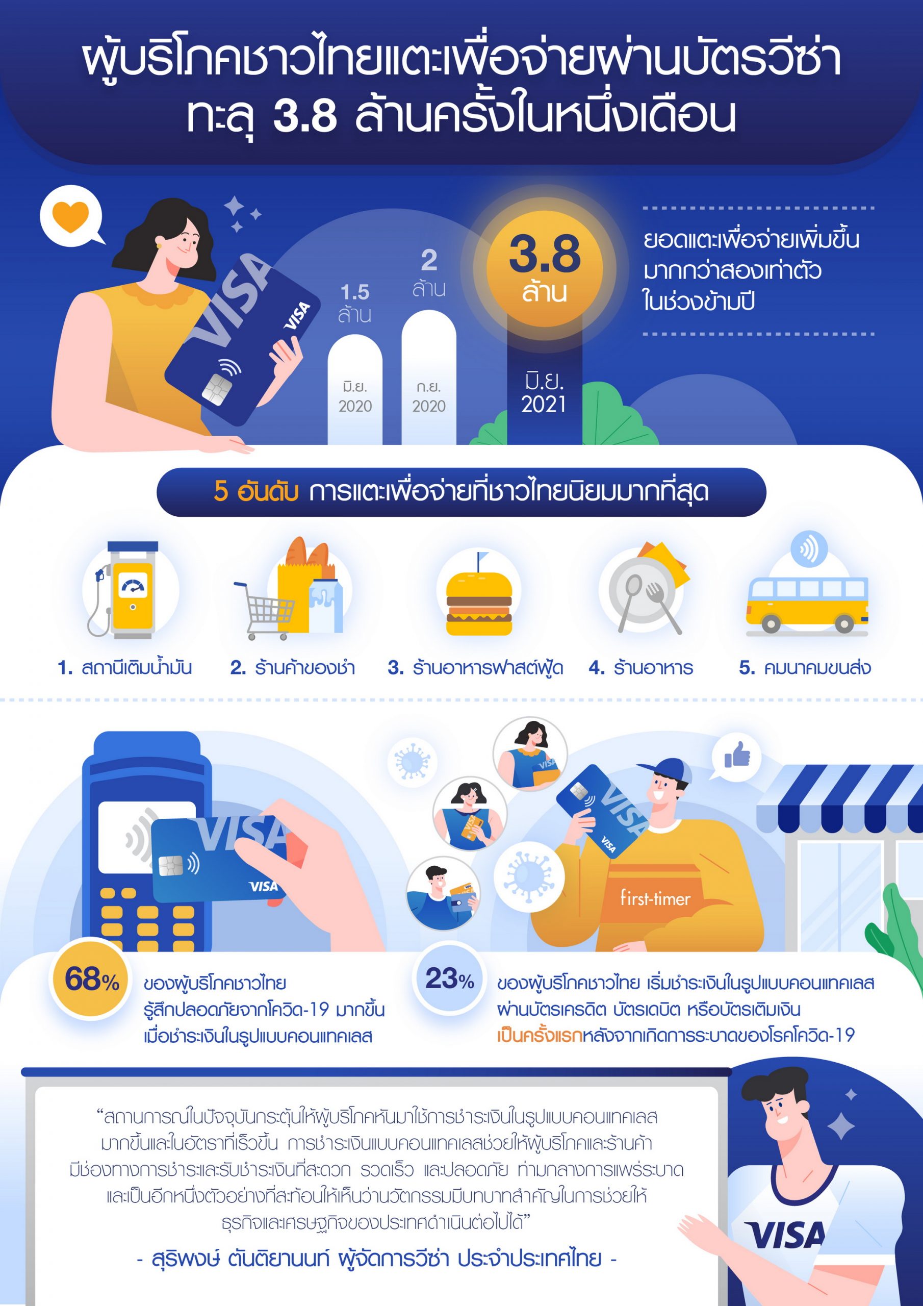 “สถานการณ์ในปัจจุบันกระตุ้นให้ผู้บริโภคหันมาใช้การชำระเงินในรูปแบบ Contactless มากขึ้นและในอัตราที่เร็วขึ้น การชำระเงินแบบ Contactless เริ่มนำมาใช้ครั้งแรกในประเทศไทยใน พ.ศ. 2551 และมียอดผู้ใช้บริการแตะเพื่อจ่ายถึงสองล้านครั้งเป็นครั้งแรกในเดือนกันยายน 2563 นับจากนั้นเราได้เห็นอัตราการใช้งานอย่างก้าวกระโดด โดยเป็นเพราะการชำระเงินแบบ Contactless นั้นช่วยให้ผู้บริโภค และร้านค้ามีช่องทางการชำระ และรับชำระเงินที่สะดวก รวดเร็ว และปลอดภัยโดยเฉพาะอย่างยิ่งท่ามกลางการแพร่ระบาดในครั้งนี้” คุณสุริพงษ์ ตันติยานนท์, ผู้จัดการวีซ่า ประจำประเทศไทยกล่าว