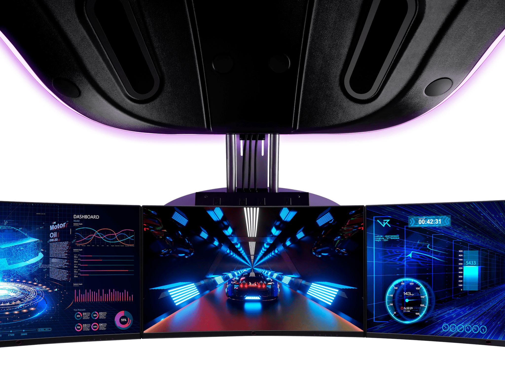 เก้าอี้ Orb X สามารถติดตั้งจอมอนิเตอร์ขนาด 34 นิ้ว 1 จอ หรือจะเลือกติดตั้งจอขนาด 27 นิ้ว 3 ตัวก็ได้ อีกทั้งยังติดตั้งระบบเสียงรอบทิศทางมาให้ในตัว ซึ่งไปประกอบไปด้วย ลำโพงขนาด Full-Range 2 ตัว, ลำโพง Tweeter ขับเสียงแหลม 2 ตัว และลำโพงซับวูฟเฟอร์ขนาด 5 นิ้ว 1 ตัว ให้ประสบการณ์เสียงแบบ Spatial Audio ที่ยอดเยี่ยม