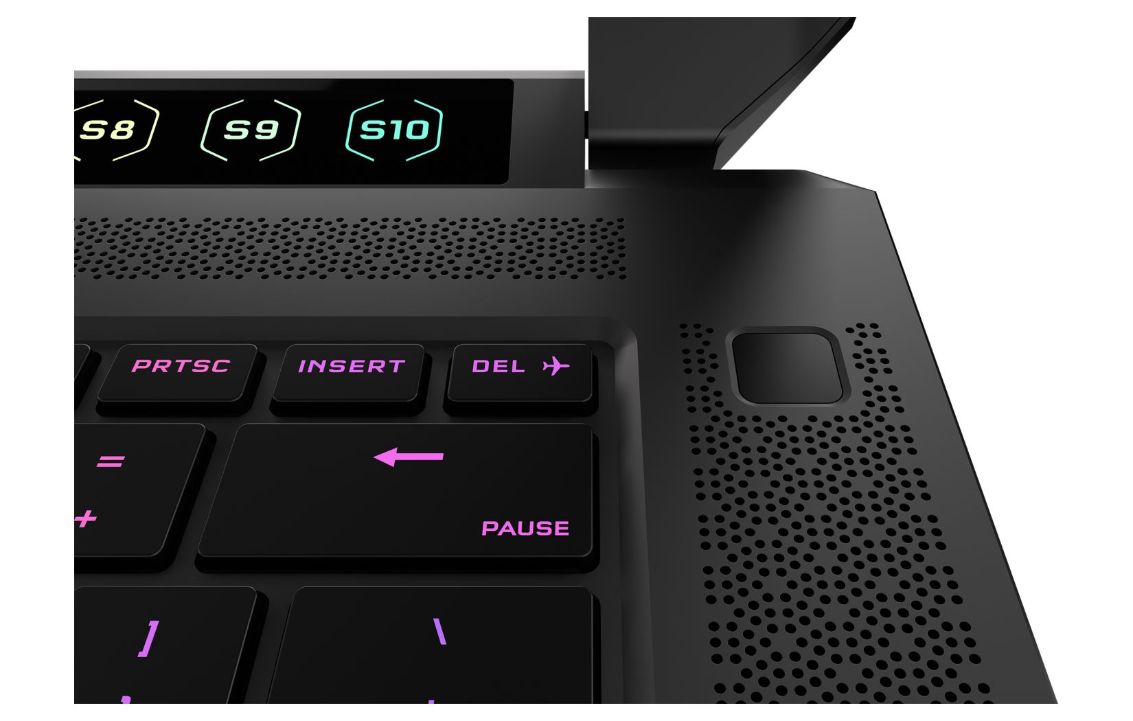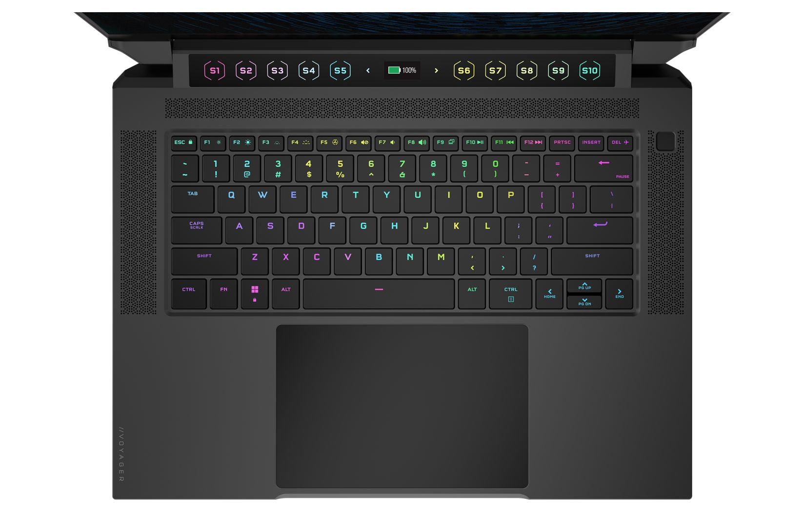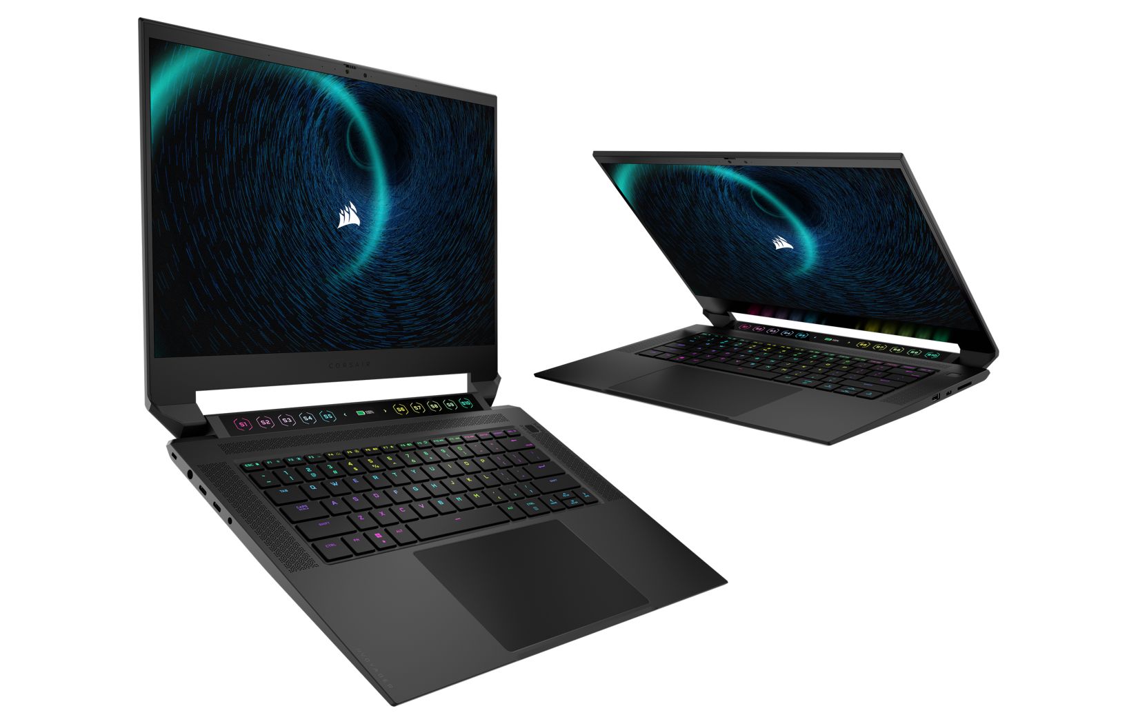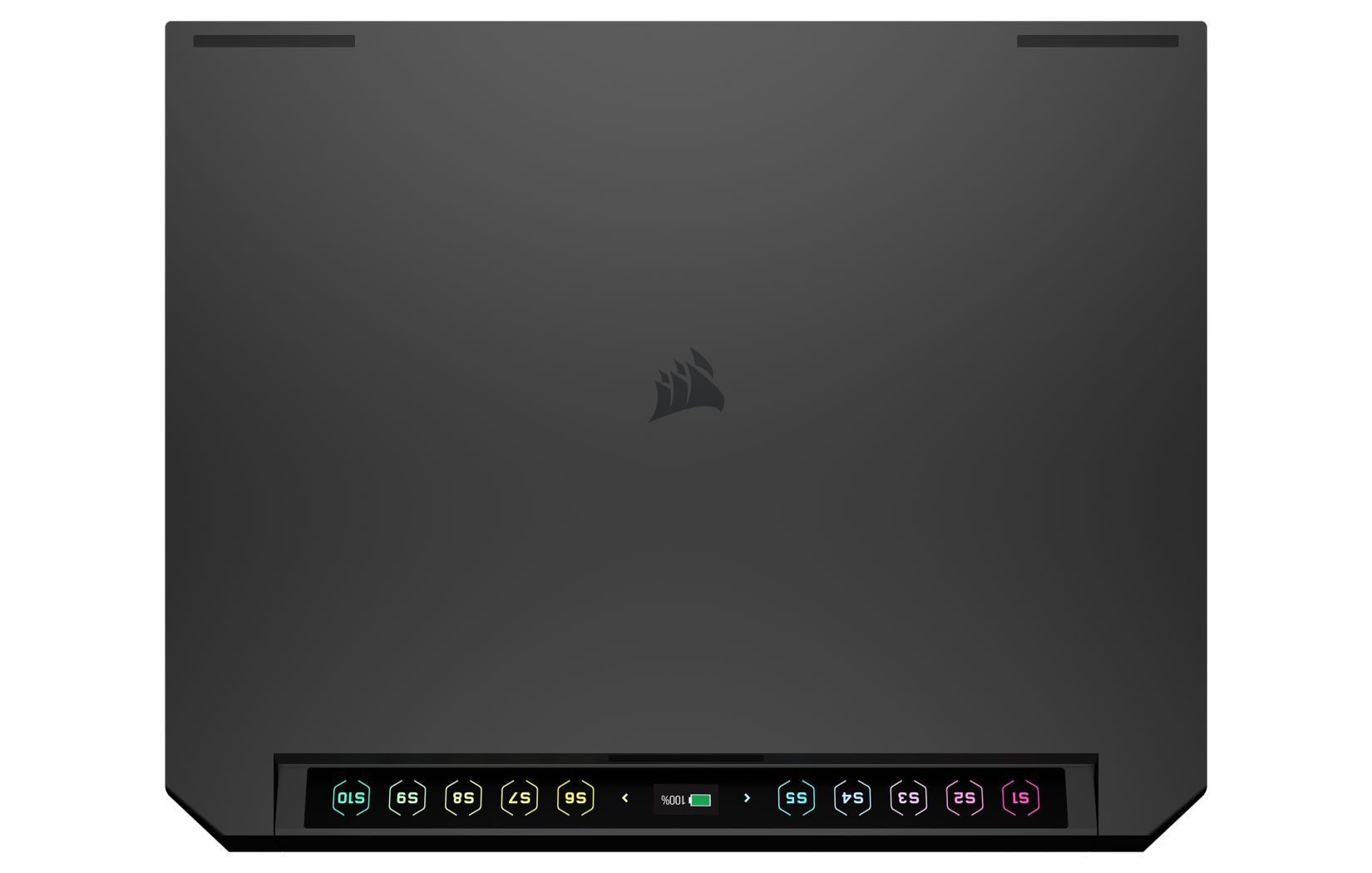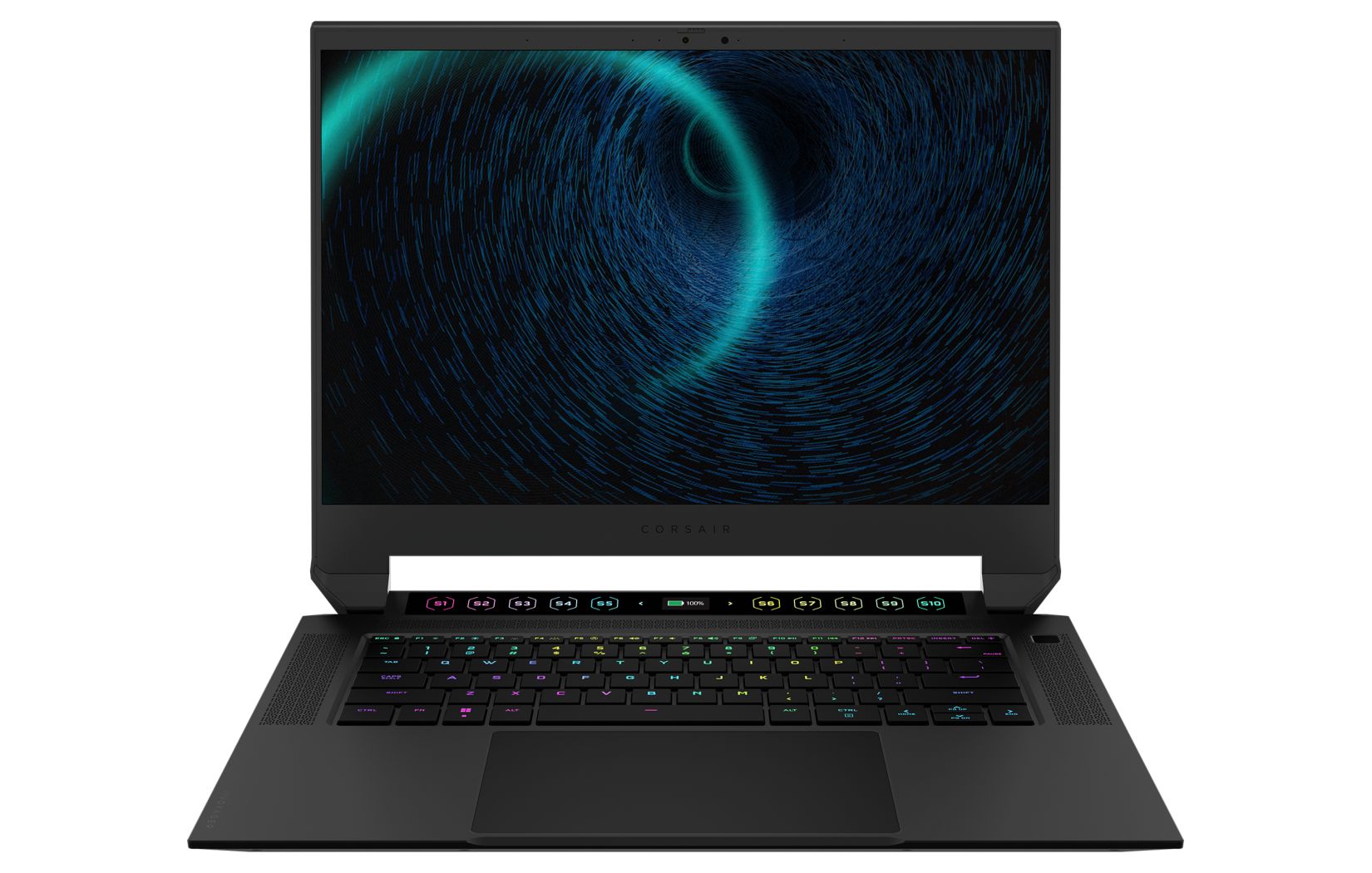 จุดเด่นที่เป็นไฮไลต์หลักเลยของโน้ตบุ๊ครุ่นนี้คือ จอ touch bar ไฟ RGB ที่วางเหนือคีย์บอร์ด ซึ่งดูแล้วก็แอบคล้ายของฝั่ง macbook ในอดีตอยู่เหมือนกัน แต่อันนี้มีความพิเศษกว่าคือสามารถ custom ตั้งเป็นปุ่มคีย์ลัดที่ทาง CORSAIR เรียกว่า “S-Key” ได้สูงสุดถึง 10 ปุ่ม (S1-S10) ส่วนตรงกลางสามารถตั้งไว้เป็นจอสำหรับแสดงเปอร์เซ็นแบตเตอรี่ได้