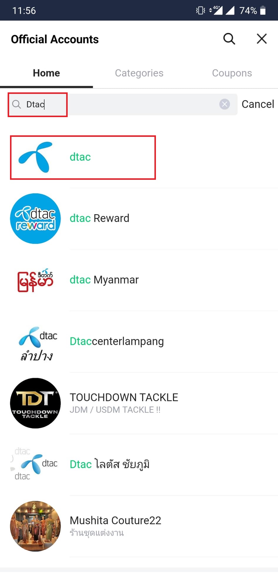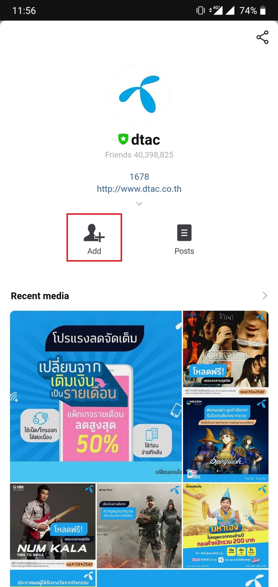 - ในช่องค้นหาพิมพ์ว่า “dtac” แล้วกด Add เพิ่มเพื่อน หรือสแกน QR Code ด้านล่าง หรือคลิกเข้าที่ http://dtac.co.th/s/FUKAZ ได้เลย