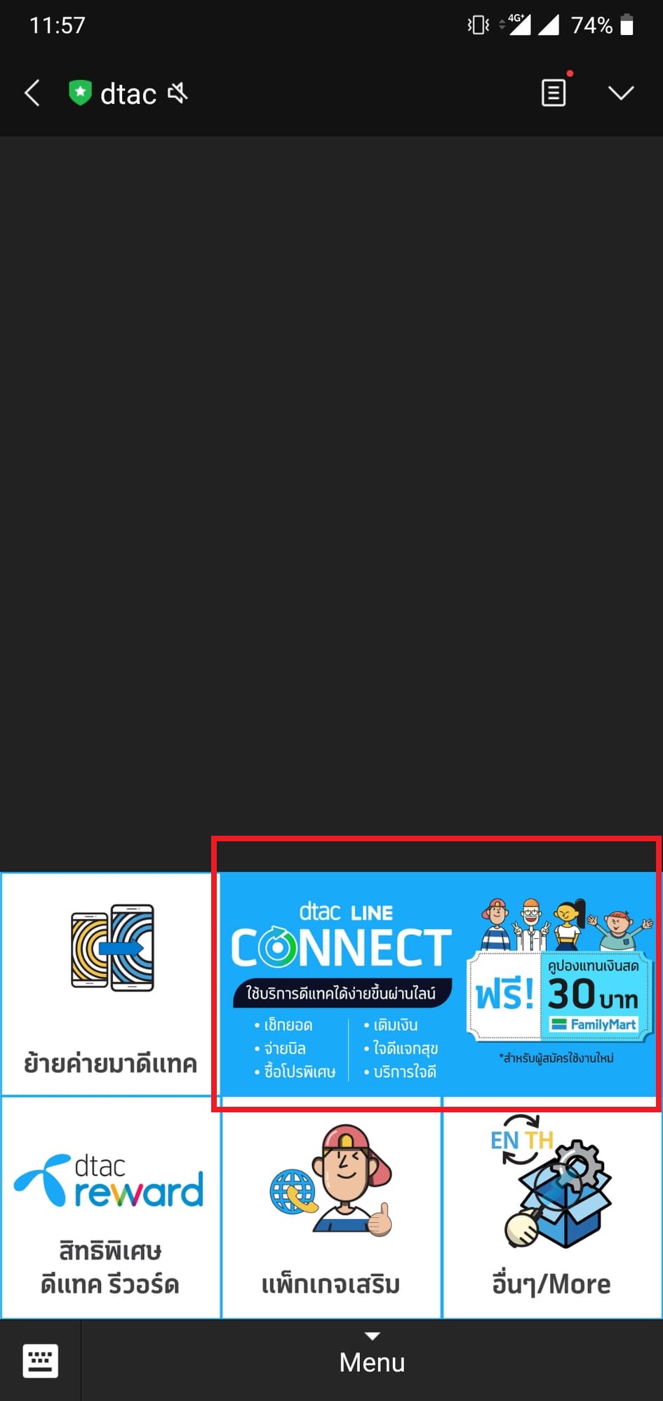 - เปิดช่องแชท dtac เลือก dtac LINE Connect