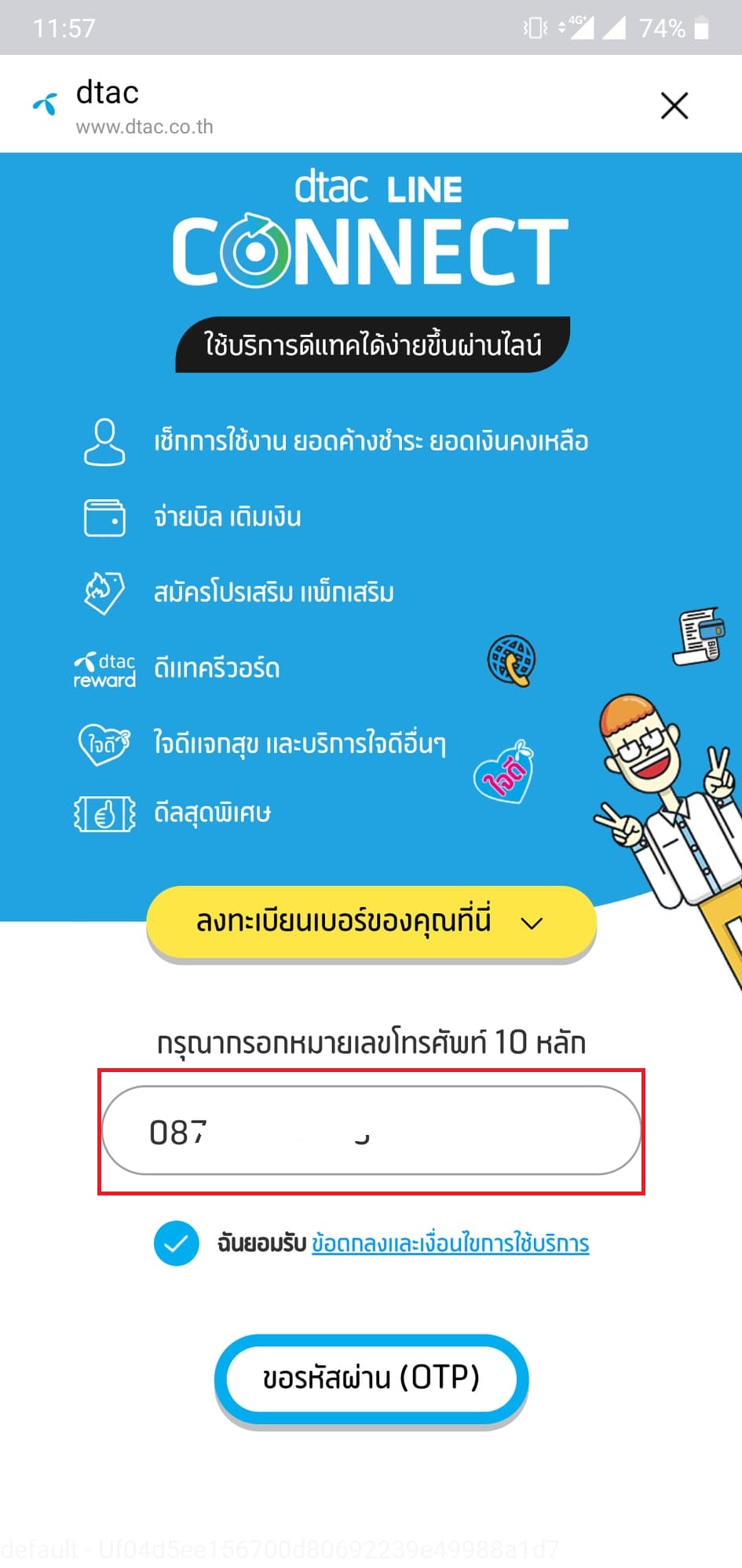 - จากนั้นกรอกเบอร์ dtac ลงในช่อง เพื่อเอารหัส OTP มาล็อคอินอีกที