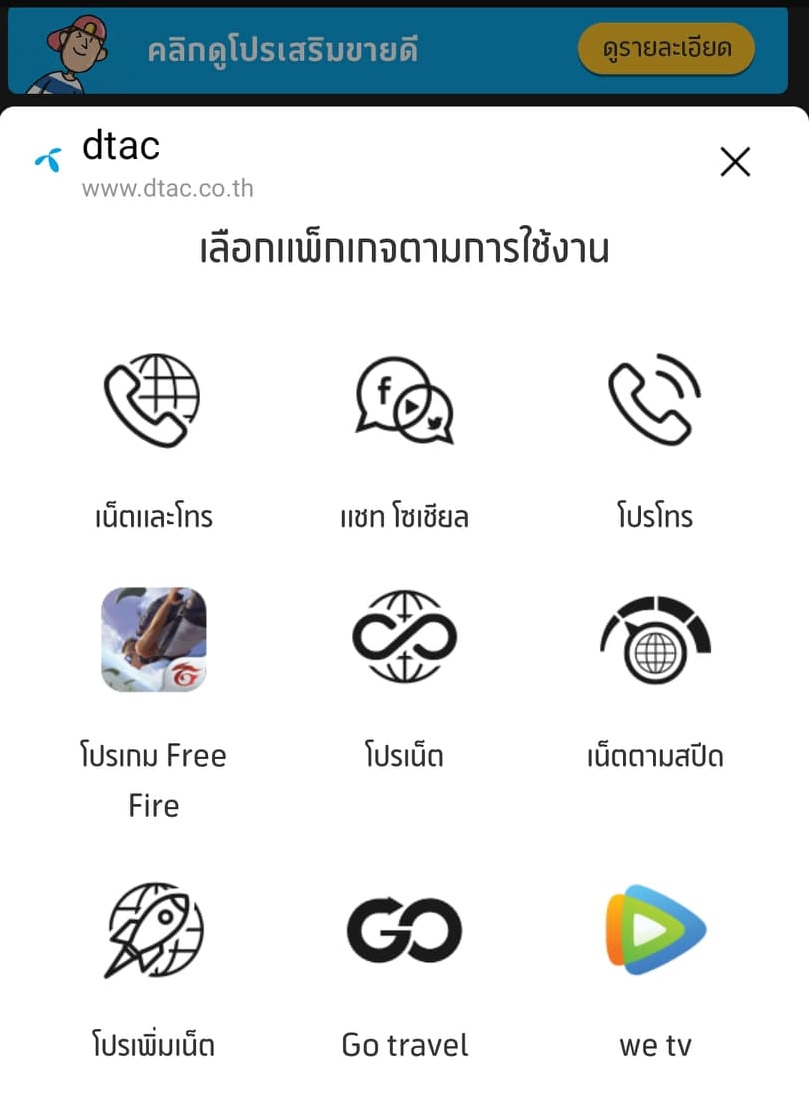 ในเมนูนี้จะเป็นการดูโปรสุดพิเศษต่างๆ ที่เราสามารถสมัครเพิ่มเติมจากโปรหลักได้ ซึ่งมีให้เลือกทั้งโปรเพิ่มเน็ต, เพิ่มโทร, Go travel (ซื้อเน็ตไปต่างประเทศ) และอื่นๆ ครบจบที่เดียว ไม่ต้องเสียเวลาไปเปิดเว็บไซต์ให้ยุ่งยาก