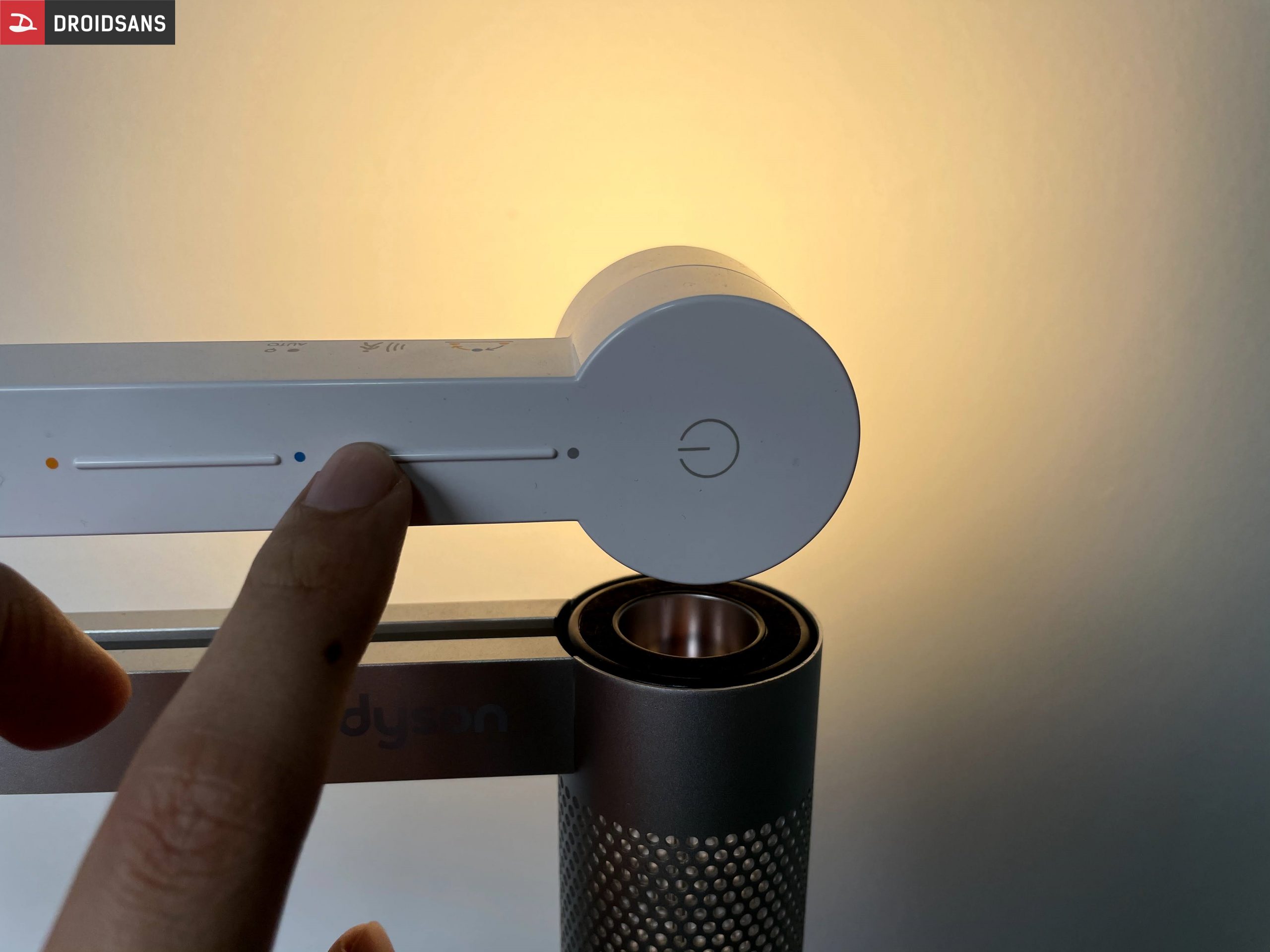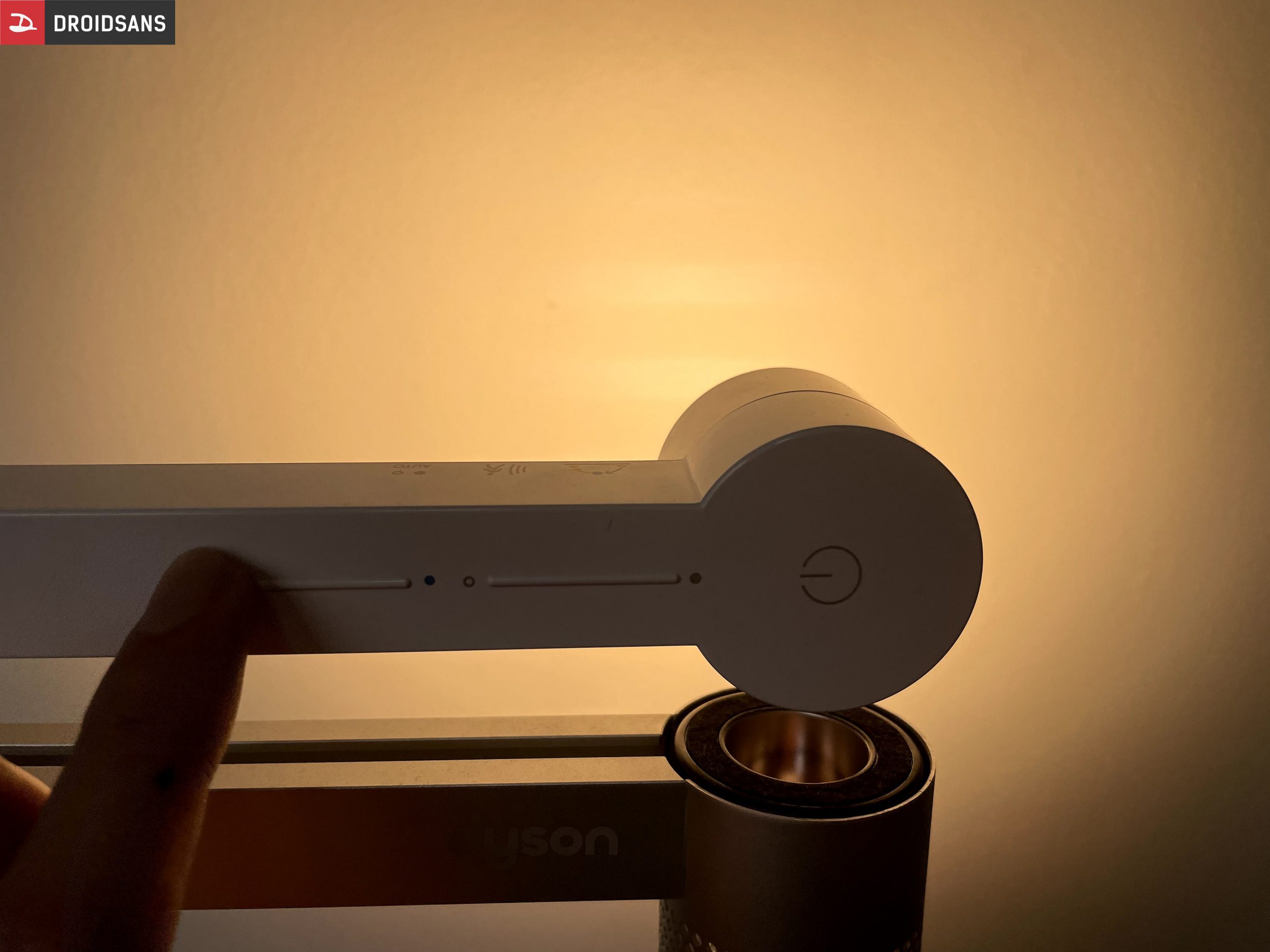 ถัดมาตรงเสาก็จะใช้เป็นวัสดุโลหะแบบด้านมีการเจาะเป็นรูถี่ ๆ เพื่อให้แสงผ่านได้ โดยสาเหตุที่ต้องมีดีไซน์แบบนี้เพราะว่าแขนของโคมไฟที่มีหลอดตรงปลาย สามารถพับกลับมาที่ตัวโคมไฟเพื่อให้แสงส่องเข้าไปแล้วกระจายออกมาตามรูพวกนั้นนั่นเองครับ ซึ่งถือว่าเป็นหนึ่งในฟีเจอร์ของ Dyson Lightcycle Morph Floor ตัวนี้เลย เพราะมันสามารถเปลี่ยนการใช้งานจากโคมไฟให้แสงสว่างตามปกติ กลายเป็นโคมไฟที่ให้แสงสว่างเรื่อ ๆ แบบ Ambient Light ได้