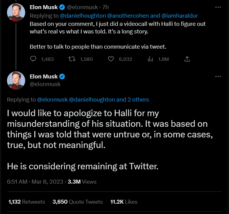 หลังจากนั้น Elon Musk ก็ได้วิดีโอคอลคุยกับ Halli เป็นการส่วนตัว สุดท้ายก็ออกมากล่าวขอโทษ Halli ที่เค้าได้ยินข้อมูลมาผิด ๆ จนเข้าใจผิดไป และบางเรื่องที่ได้ฟังมาก็ไม่ได้มีประโยชน์อะไร จนทำสถานการณ์วุ่นวายเกินไปใหญ่