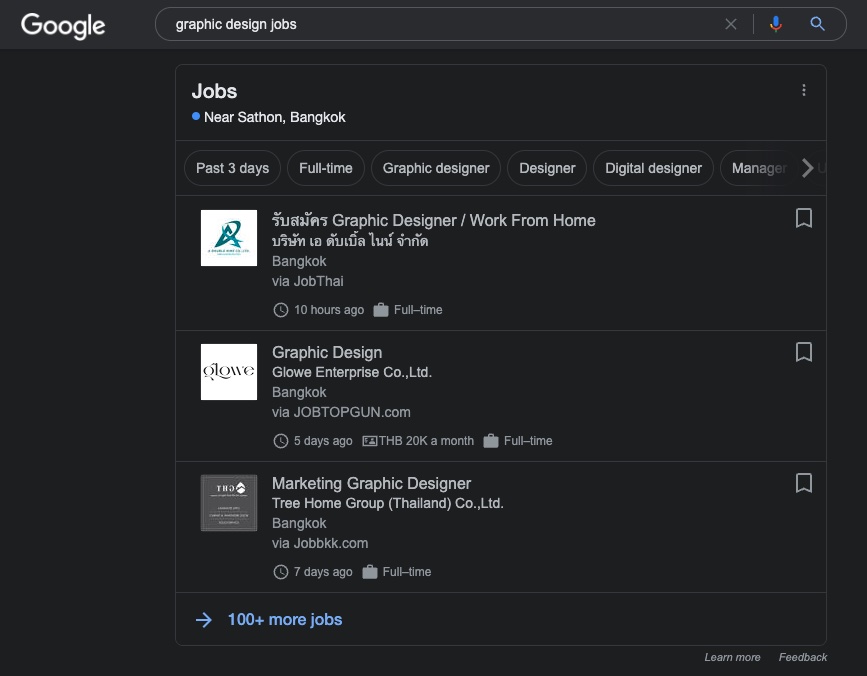 Tips: หากค้นหาแล้วไม่เจอหน้า Google Jobs ขึ้นมา ให้ตรวจสอบว่าคำค้นหาว่าถูกภาษาหรือไม่ หากตั้งค่าภาษาของเครื่องหรือแอปเป็นอังกฤษอยู่ จะต้องค้นหาด้วยคีย์เวิร์ดเป็นภาษานั้นๆ จึงจะแสดงผลหน้า Jobs ขึ้นมาให้เห็นนะ