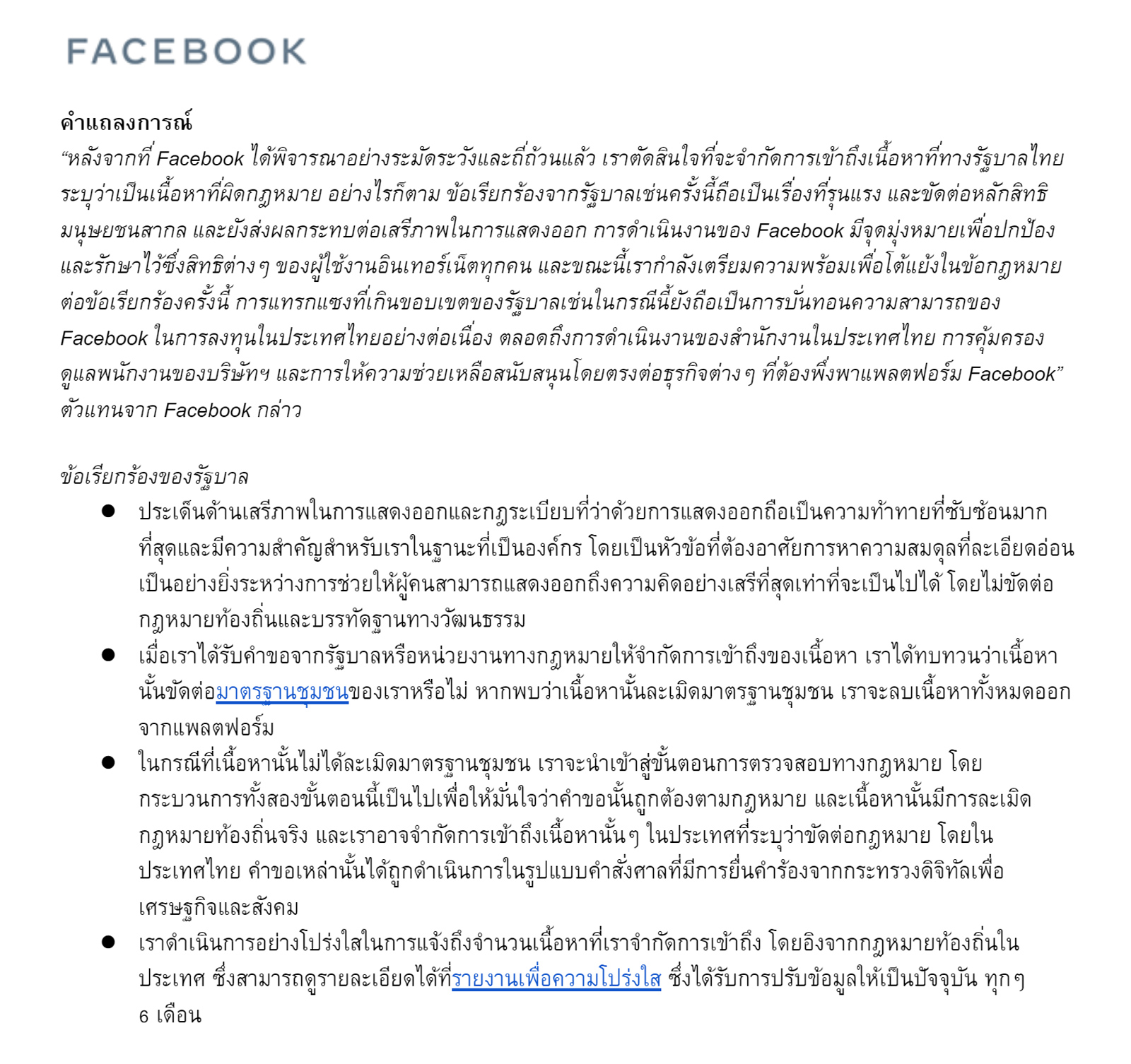 “หลังจากที่ Facebook ได้พิจารณาอย่างระมัดระวังและถี่ถ้วนแล้ว เราตัดสินใจที่จะจำกัดการเข้าถึงเนื้อหาที่ทางรัฐบาลไทยระบุว่าเป็นเนื้อหาที่ผิดกฎหมาย อย่างไรก็ตาม ข้อเรียกร้องจากรัฐบาลเช่นครั้งนี้ถือเป็นเรื่องที่รุนแรง และขัดต่อหลักสิทธิมนุษยชนสากล และยังส่งผลกระทบต่อเสรีภาพในการแสดงออก การดำเนินงานของ Facebook มีจุดมุ่งหมายเพื่อปกป้องและรักษาไว้ซึ่งสิทธิต่างๆ ของผู้ใช้งานอินเทอร์เน็ตทุกคน และขณะนี้เรากำลังเตรียมความพร้อมเพื่อโต้แย้งในข้อกฎหมายต่อข้อเรียกร้องครั้งนี้ การแทรกแซงที่เกินขอบเขตของรัฐบาลเช่นในกรณีนี้ยังถือเป็นการบั่นทอนความสามารถของ Facebook ในการลงทุนในประเทศไทยอย่างต่อเนื่อง ตลอดถึงการดำเนินงานของสำนักงานในประเทศไทย การคุ้มครองดูแลพนักงานของบริษัทฯ และการให้ความช่วยเหลือสนับสนุนโดยตรงต่อธุรกิจต่างๆ ที่ต้องพึ่งพาแพลตฟอร์ม Facebook” ตัวแทนจาก Facebook กล่าว