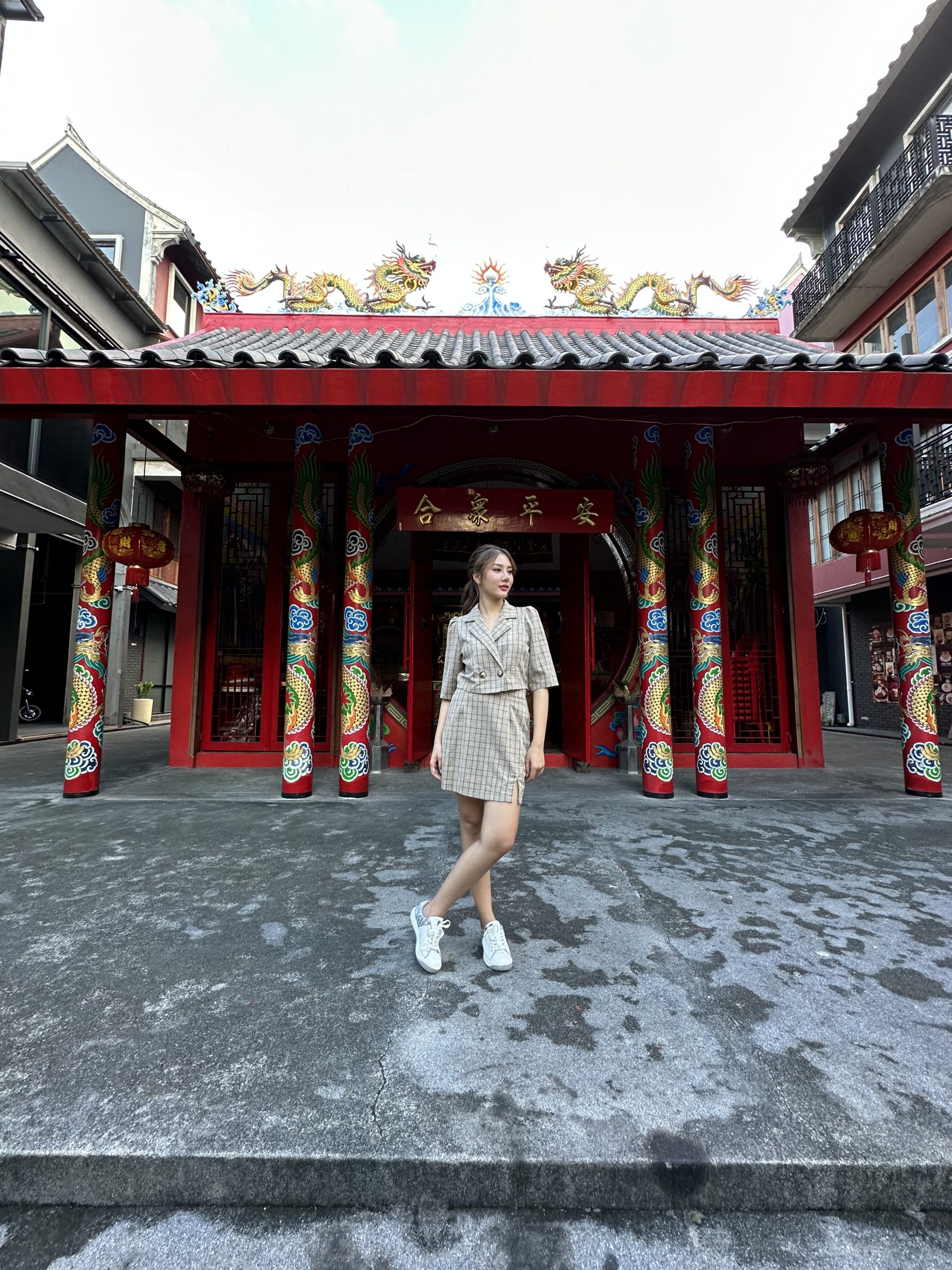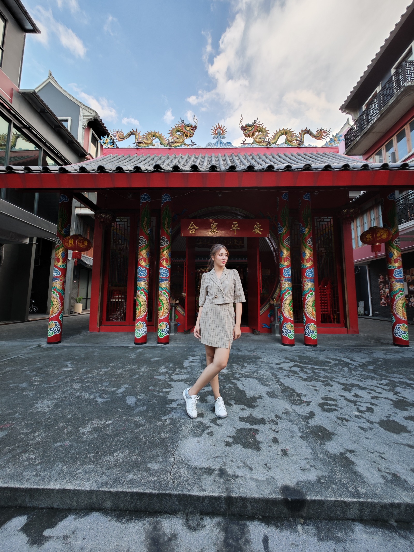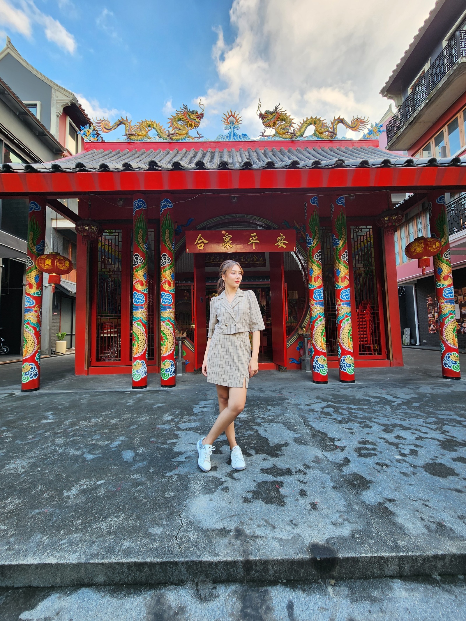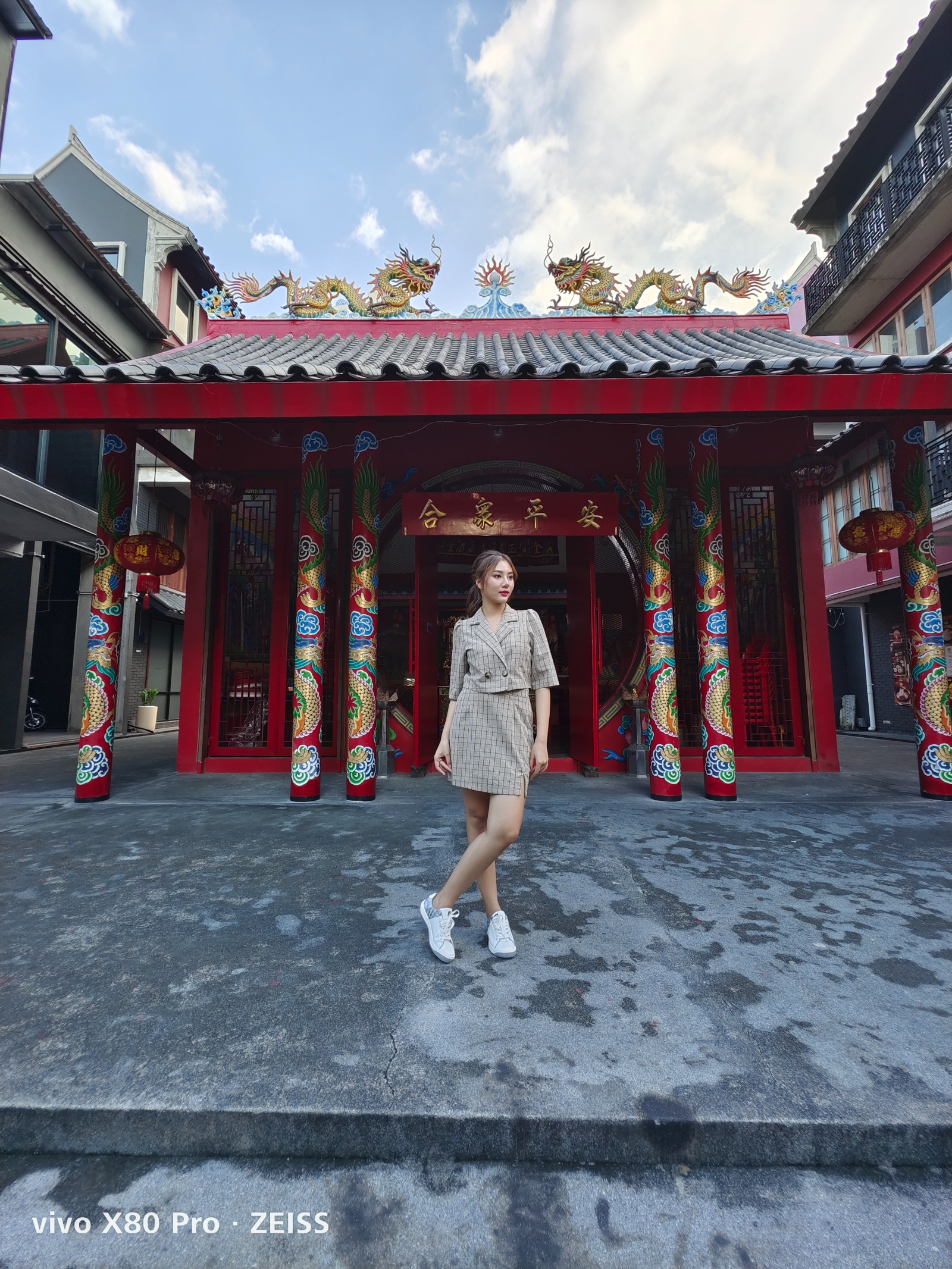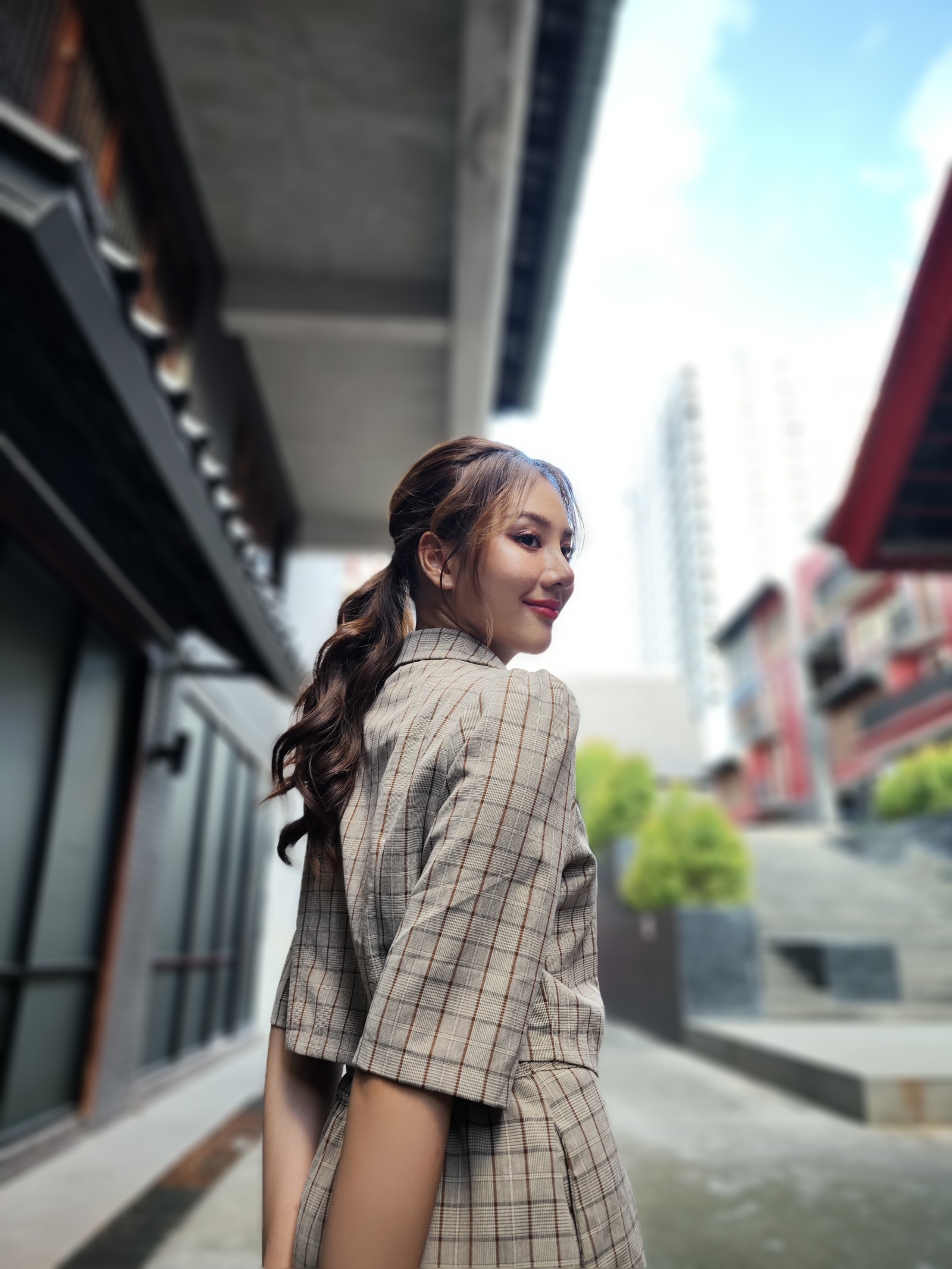 ลองมาใช้โหมด HDR ในกล้องหลักกันหน่อย ฉากนี้ก็มีจุดเด่นเป็นสีสันของอาคารศาลเจ้า และมุมมืดด้านในที่ตัดกับท้องฟ้าที่มีแสงสว่างจ้าสุด ๆ ลองส่องดูจะเห็นว่า บางรุ่นมีหลุดไปบ้าง อย่าง iPhone ถ่ายแล้วท้องฟ้าสว่างเกินจนกลายเป็นสีขาว ซึ่งลองกดใหม่ 2-3 รอบก็ยังแก้ไม่หาย ส่วน Samsung แม้จะยังคงท้องฟ้าและตัวศาลเจ้าเอาไว้ได้ แต่กลับยกแสงนางแบบจนดูสว่างจ้าไปด้วย