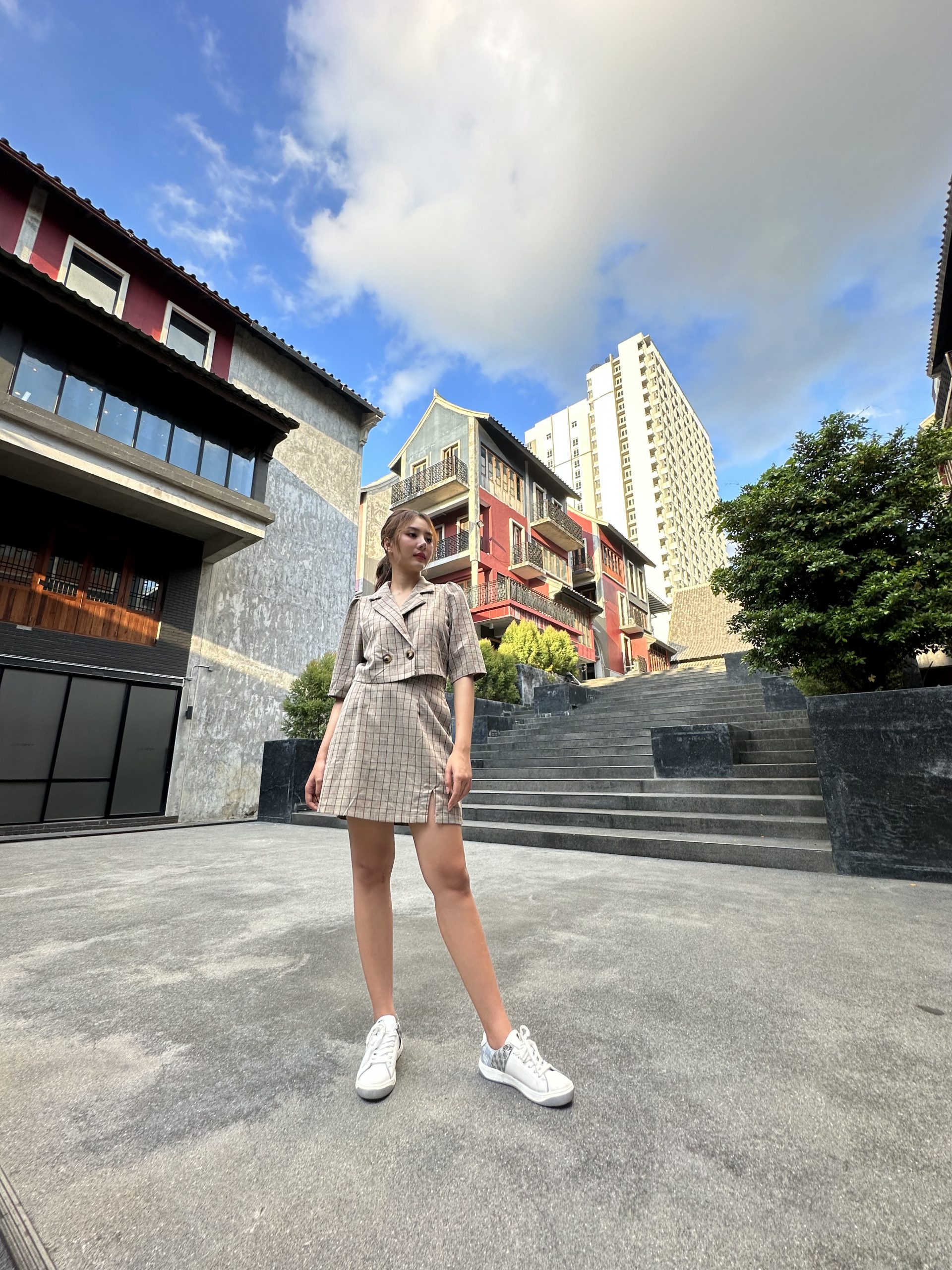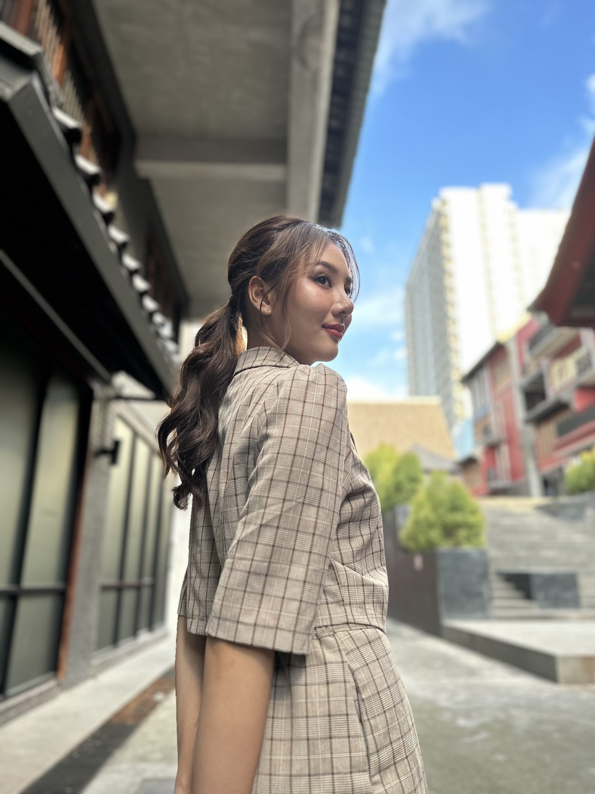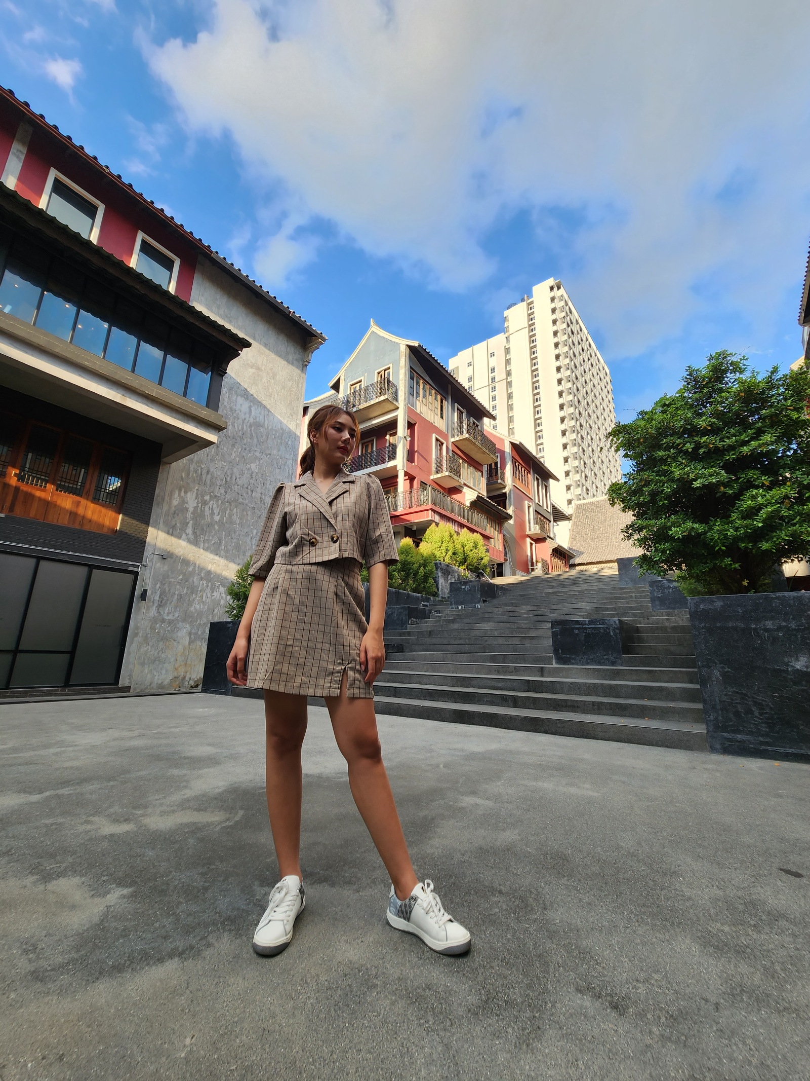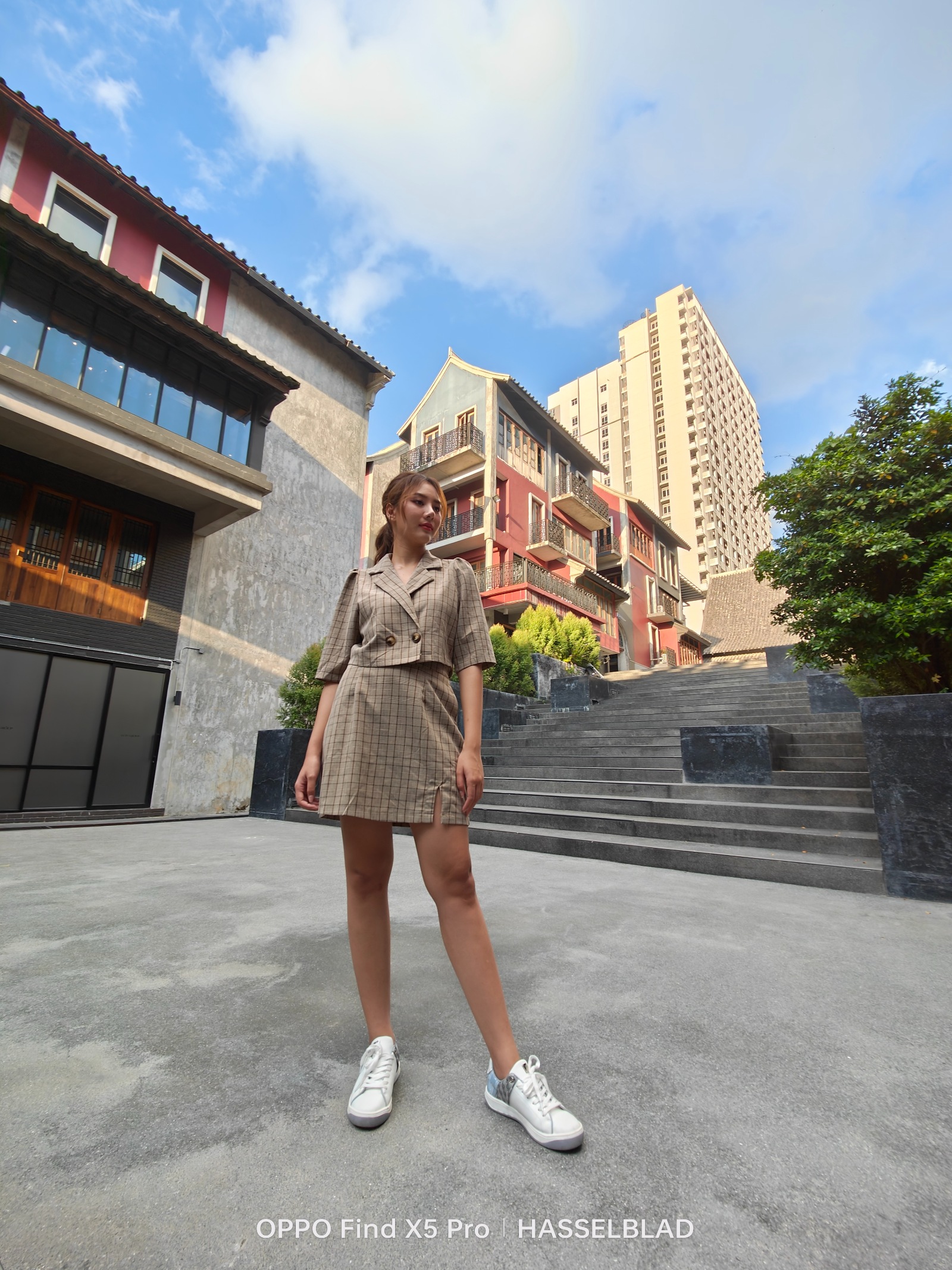 อัลตราไวด์ชุดนี้เป็นภาพนางแบบยืนอยู่ในสถานที่มีรายละเอียดเยอะ และมี dynamic range สูง แต่ละรุ่นมีความบิดเบี้ยวของภาพตามองศาเลนส์พอ ๆ กัน แต่จะเห็นว่า iPhone 14 Pro Max มีการขยับแสงภาพให้สว่างมากทั้งภาพ ทำเอาสีรองเท้า และตึกด้านหลังรายละเอียดหายไปบ้าง แต่ก็รักษาสกินโทนให้สีสวยไว้ได้ ส่วน Xiaomi ก็มีหลุดตึกหายไปเหมือนกัน แต่ภาพส่วนอื่นยังดูมืดไม่สมดุล ในขณะที่ Samsung มีภาพสีสดแต่ยอมปล่อยวัตถุคนมืดลงไปได้ ทำให้นางแบบที่เป็นจุดเด่นของภาพโดนกลบไป แต่สิ่งแวดล้อมรอบ ๆ ดันสวยแทน