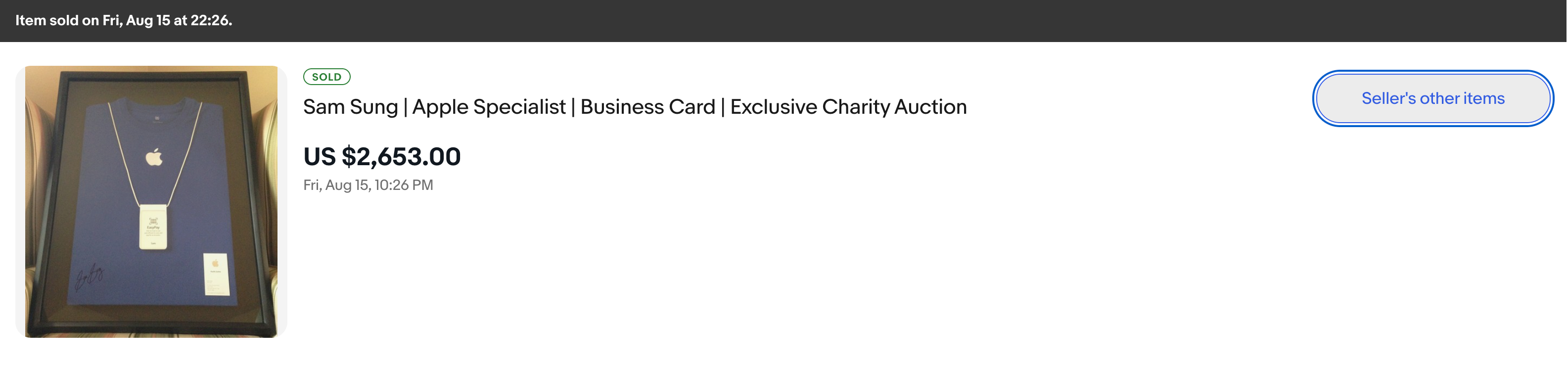 หนึ่งปีต่อมา 2014 ตัวของ Sam ตัดสินใจนำนามบัตรและเสื้อยูนิฟอร์ม Apple ไปประมูลบนเว็บไซต์ eBAY เพื่อหาเงินช่วยองค์กรการกุศล Children’s Wish Foundation และได้เงินจากการประมูลไปเป็นจำนวนกว่า 2,500 ดอลลาร์สหรัฐฯ พร้อมตัดสินใจเปลี่ยนนามสกุลใหม่ของตัวเองเป็น Struan ซึ่งเป็นชื่อหมู่บ้านเล็กๆ บนเกาะ Isle of Skye ในสกอตแลนด์ที่เจ้าตัวชื่นชอบ