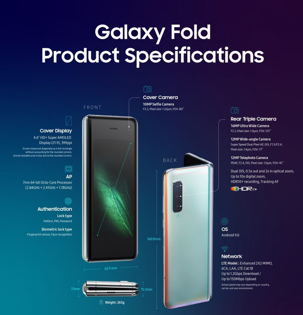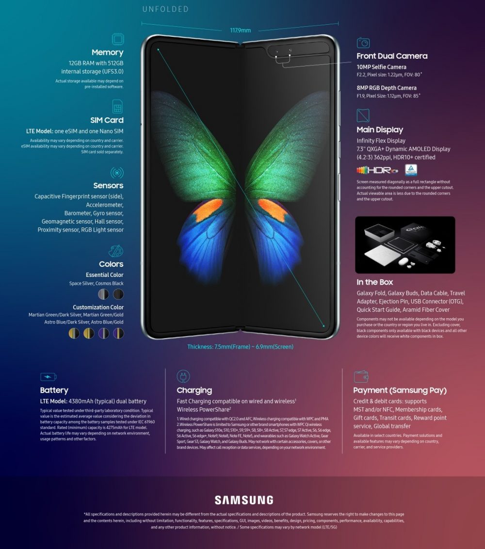 - In the Box : อุปกรณ์ในกล่อง ตัวเครื่อง Galaxy Fold, หูฟังไร้สาย Galaxy Buds, สายชาร์จ, หม้อแปลง, เข็มจิ้มถาดซิม, ตัวแปลง USB OTG, คู่มือ, เคส