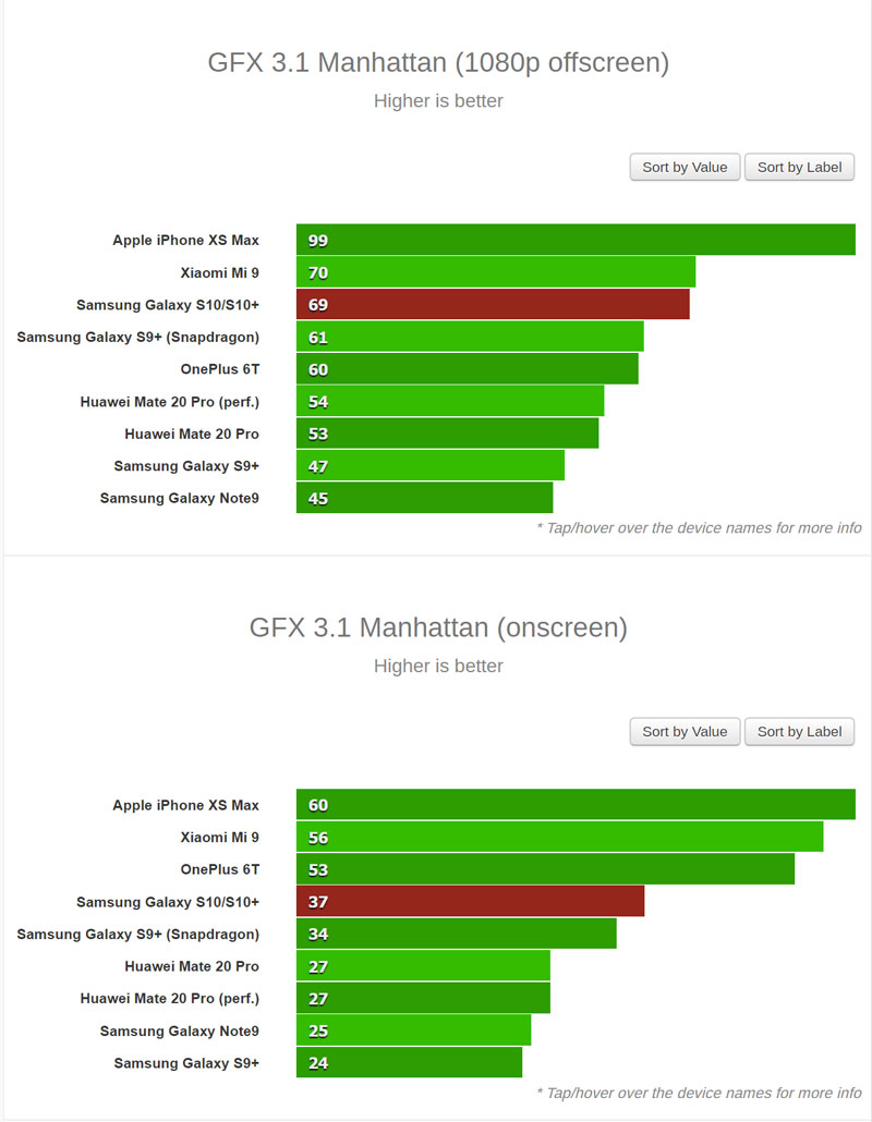 ส่วนการทดสอบกราฟิกล้วนๆ ผ่าน GFX Bench นั้น ในบางการทดสอบผลก็ออกมาสูสีกัน แต่ในบางการทดสอบก็พ่ายแพ้ให้กับพลังของ Adreno 640 เรียกว่าพลังของ GPU ของ Exynos 9820 นั้นก็ติดอยู่ในกลุ่มเรือธงของชิปเซ็ตเช่นเดียวกัน