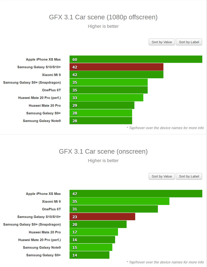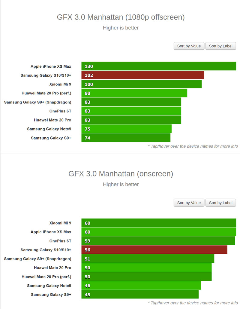 ส่วนการทดสอบกราฟิกล้วนๆ ผ่าน GFX Bench นั้น ในบางการทดสอบผลก็ออกมาสูสีกัน แต่ในบางการทดสอบก็พ่ายแพ้ให้กับพลังของ Adreno 640 เรียกว่าพลังของ GPU ของ Exynos 9820 นั้นก็ติดอยู่ในกลุ่มเรือธงของชิปเซ็ตเช่นเดียวกัน