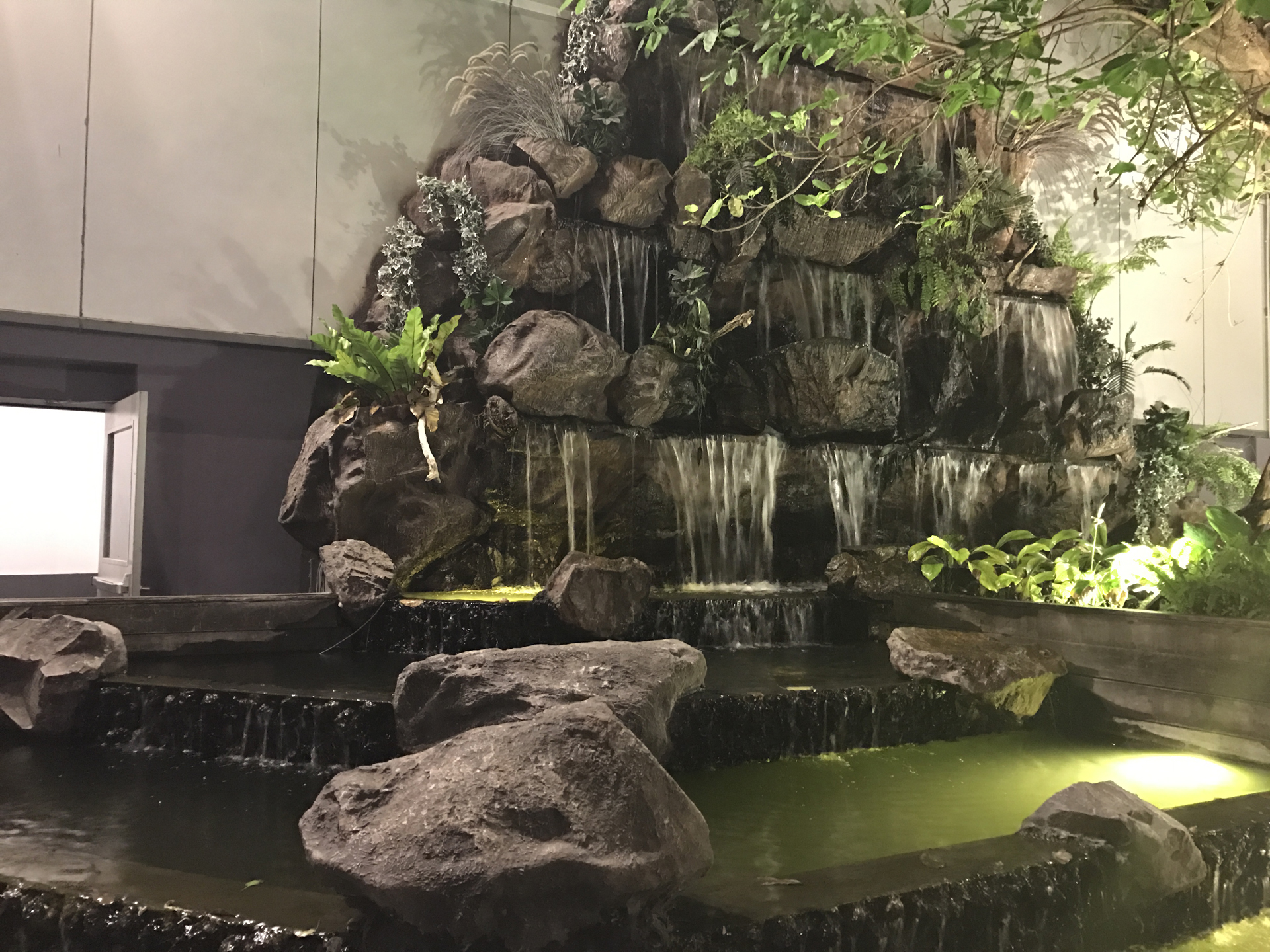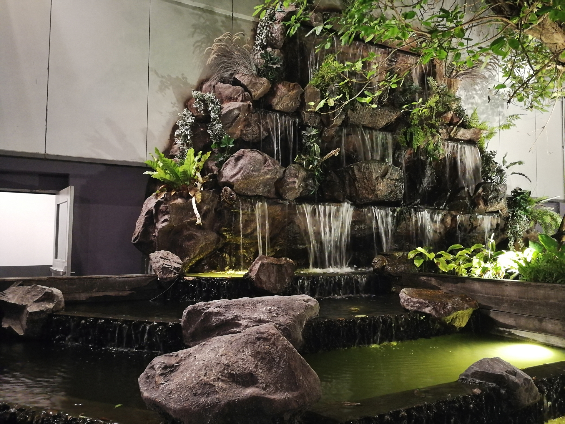 อันนี้เป็นน้ำตกนอกอาคาร ถ่ายตอนฟ้ามืดแล้ว แต่มีแสงไฟอยู่รอบๆ โฟกัสที่เดียวกันคือหินก้อนตรงกลางน้ำตก