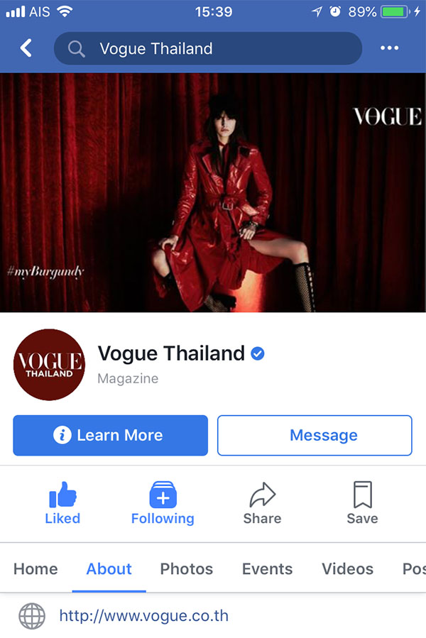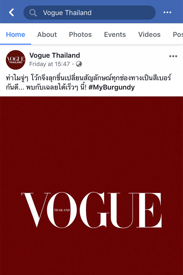 ซึ่งในช่วงนี้ถ้าใครติดตามเพจ Facebook และ Instagram ของทางนิตยสาร Vogue Thailand น่าจะเห็นว่ามีการเปลี่ยนภาพ Display และ Cover ให้มีสี Burgundy อยู่ในภาพและถ้าโพสต์ภาพที่มีสี Burgundy ก็จะมีการติด #myburgundy อีกด้วย