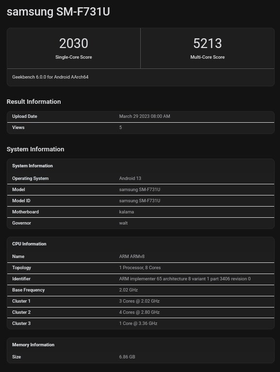 ในด้านความแรง Galaxy Z Flip5 (SM-F731U) ได้คะแนน Single-core ไป 2030 ส่วนคะแนน Multi-core เป็น 5213 คะแนน