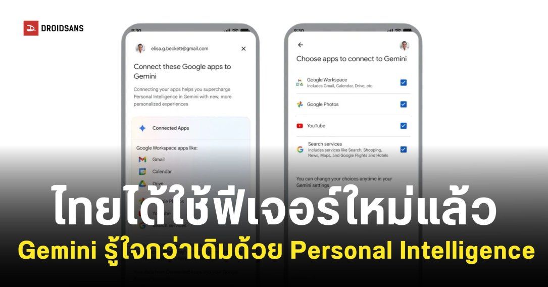 Google ประกาศขยายการเข้าถึงฟีเจอร์ Personal Intelligence หลังจากเปิดให้ทดลองใช้เฉพาะในสหรัฐอเมริกาไปก่อนหน้านี้ โดยประเทศไทยก็เป็นหนึ่งในประเทศที่สามารถใช้งานได้แล้วเช่นกัน ช่วยให้ Gemini รู้จักและรู้ใจเรามากยิ่งขึ้น