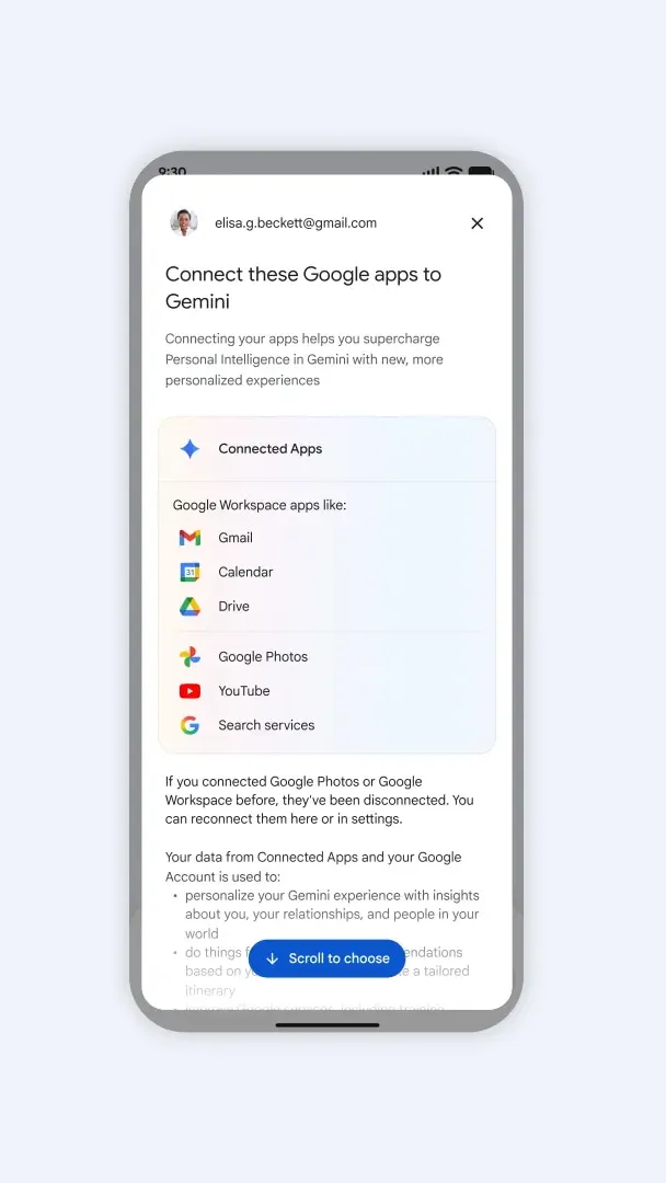 Personal Intelligence คือหนึ่งในฟีเจอร์ของ Gemini ที่ผู้ใช้เลือกได้ว่าจะให้บริการไหนของ Google เชื่อมต่อเข้ากับ Gemini เพื่อให้รู้จักหรือเข้าถึงข้อมูลพื้นฐานของเราได้บ้าง เช่น Gmail, YouTube, Calendar, Drive, Search และ Maps เป็นต้น ทำให้คำตอบที่เราคุยกับแชตบอทนั้นตรงใจมากยิ่งขึ้น