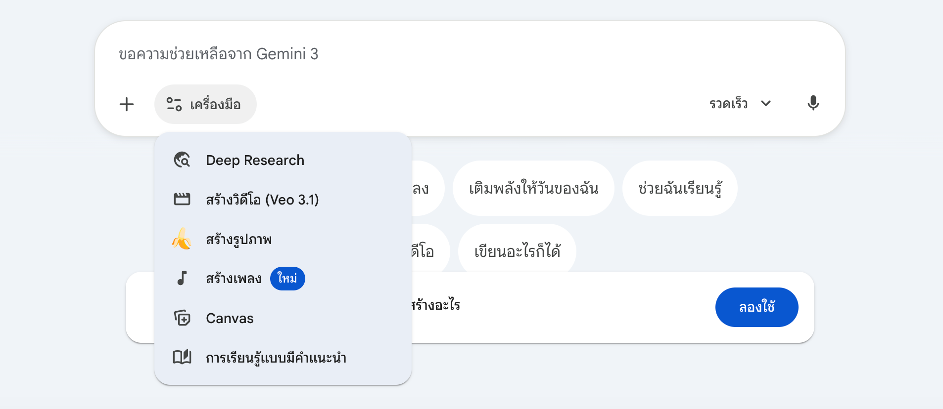 จากที่ได้ลองทดสอบ Gemini บนมือถือของผู้เขียนยังไม่ปรากฏเครื่องมือ “สร้างเพลง” ให้ใช้งาน แต่ตอนนี้บนเดสก์ท็อปสามารถใช้งานได้แล้ว และรองรับการ Prompt หรือขอให้สร้างเนื้อเพลงเป็นภาษาไทยด้วย