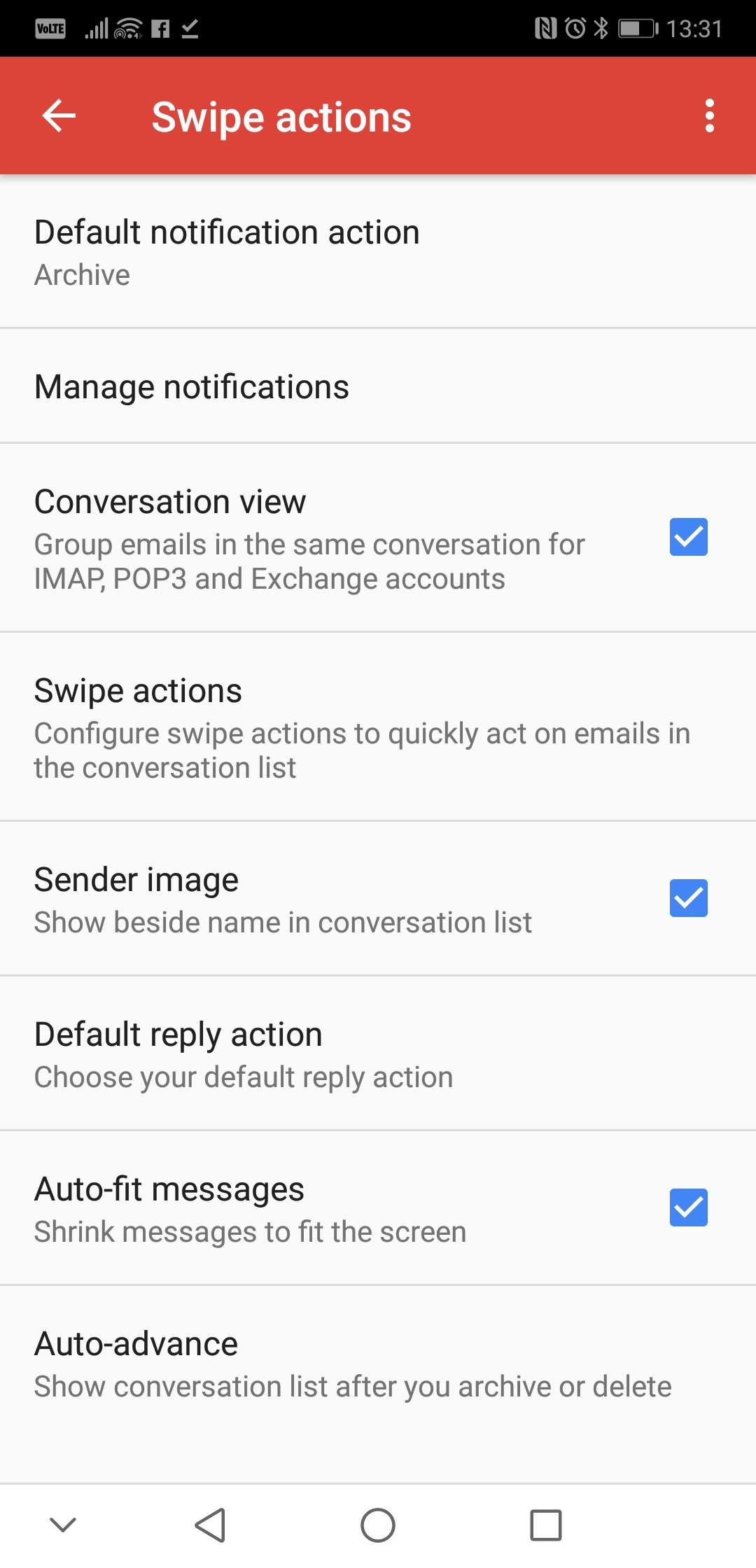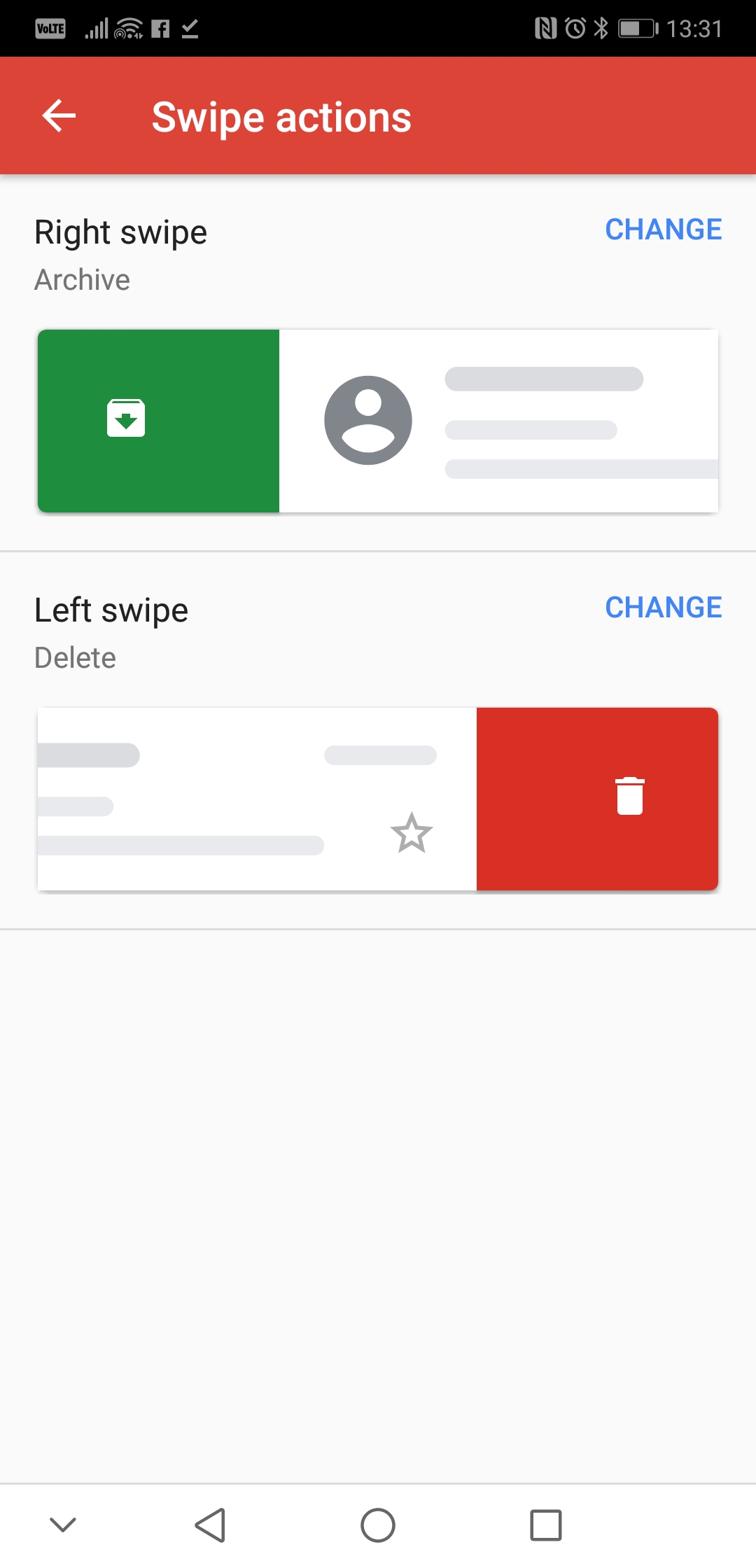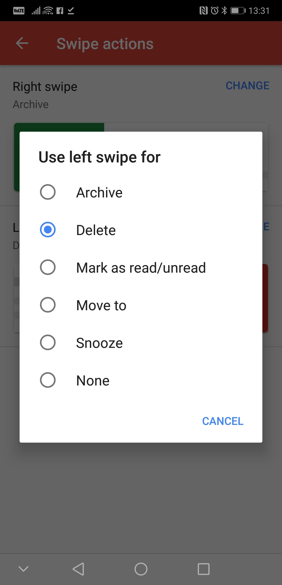 โดยเราสามารถตั้งค่าให้การปัดนี้เป็นได้ทั้ง การจัดเก็บ (Archive), ลบทิ้ง (Delete), ทำเครื่องหมายอ่าน (Mark as read/unread), ย้ายไป (Move to), แจ้งเตือนอีกครั้ง (Snooze), หรือไม่เกิดอะไรเลย (None) ก็ได้