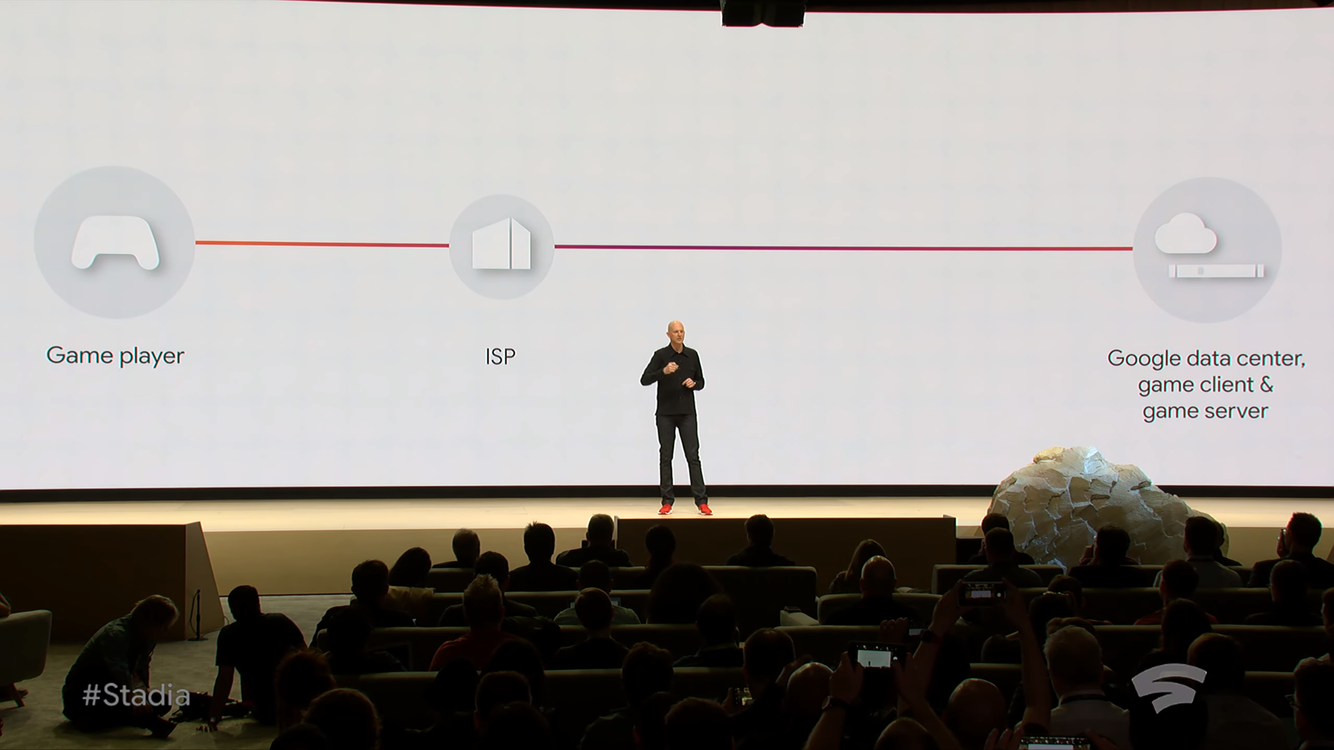 อีกจุดเด่นของก็คือเรื่องของโครงสร้างระบบที่จากเดิมการเล่นเกมผ่านอินเทอร์เน็ตจะมีตัวกลางระหว่างการเชื่อมต่อมากมายกว่าจะไปถึงเซิฟเวอร์ แต่สำหรับ Stadia นั้นจะเป็นการเชื่อมต่อที่ค่อนข้างตรงกับผู้ให้บริการอินเทอร์เน็ต ด้วยการที่กูเกิลที่ศูนย์ข้อมูลกระจายไปอยู่ทั่วโลกนั่นเอง ความแลค ความหน่วงจะหายไปอีกเพียบ