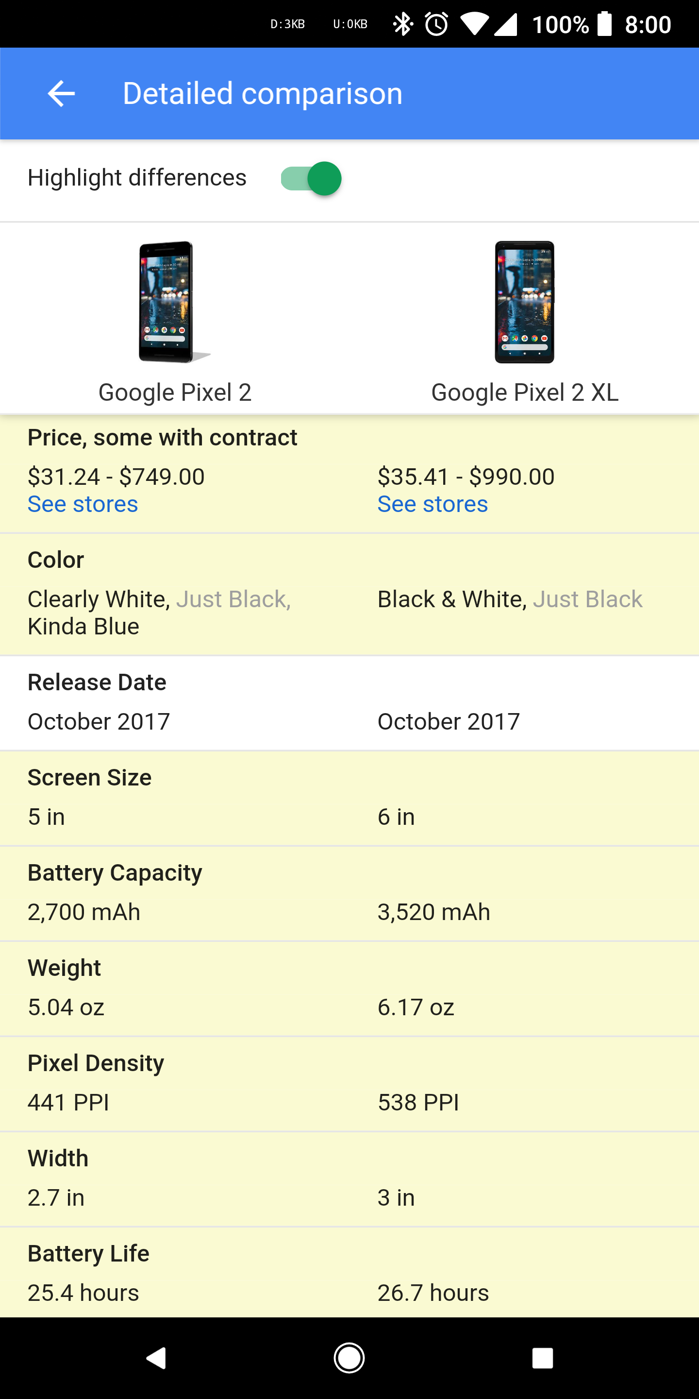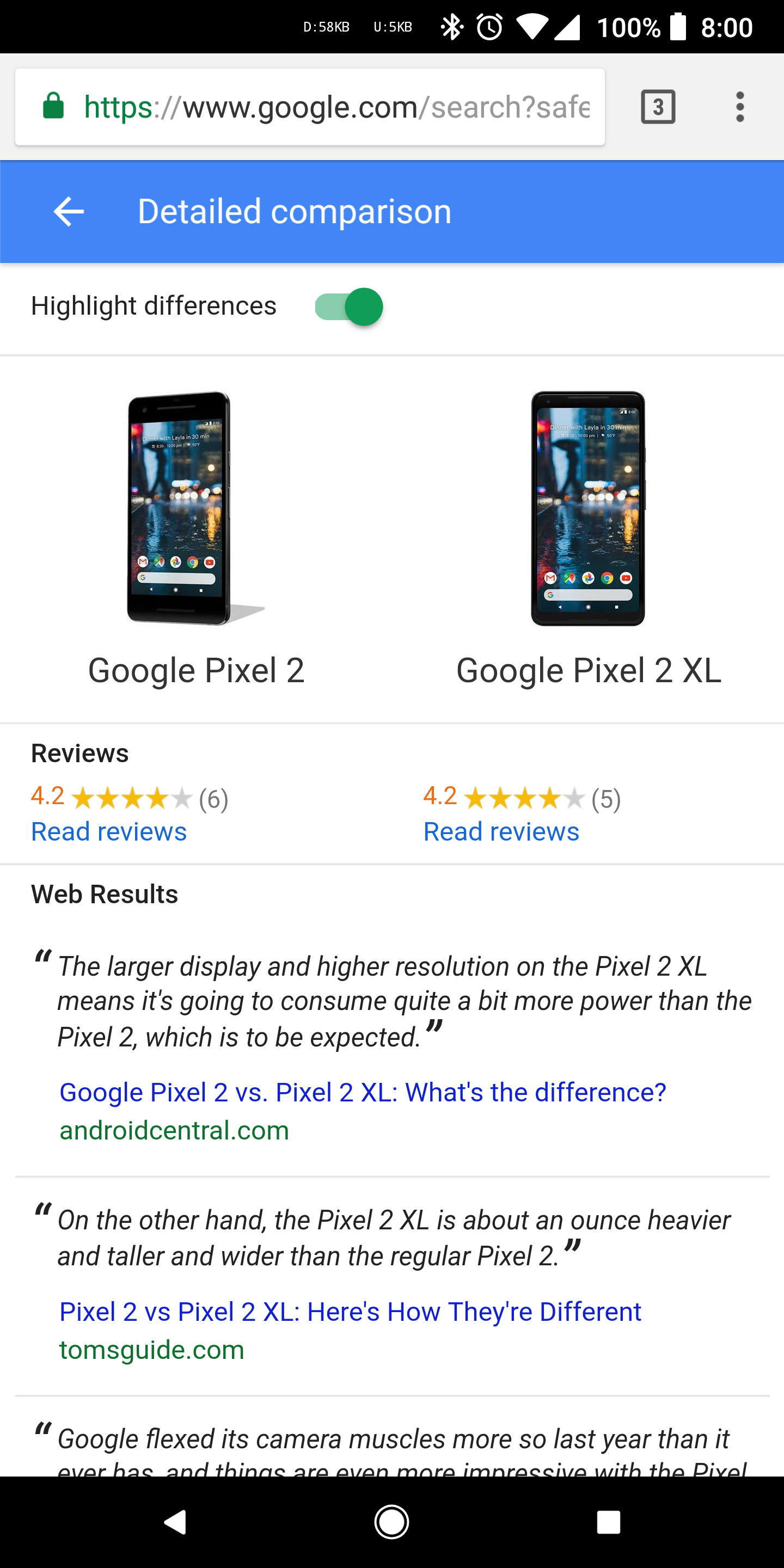 ตอนนี้มีผู้ใช้บางคนรายงานว่าสามารถใส่ คำค้นที่มี “vs” เพื่อเปรียบเทียบมือถือ 2 รุ่น (ตัวอย่างเช่น Pixel 2 vs Pixel 2 XL) แล้ว Google จะแสดงผลลัพธ์แบบเปรียบเทียบสเปกเป็นตารางขึ้นมาให้ดูได้เลยครับ นอกจากนั้นยังสามารถ highlight จุดต่างบนสเปกของมือถือที่เปรียบเทียบกันอยู่ได้ด้วย สามารถใช้ได้ทั้งบน PC และมือถือเลย