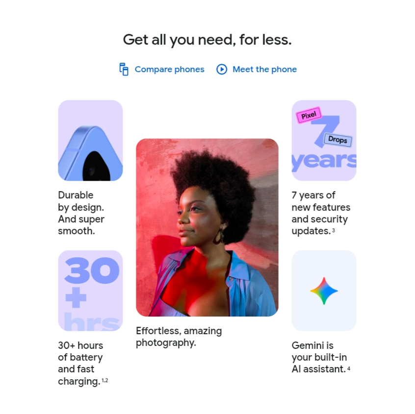 “การอัปเกรดความเร็วการชาร์จ” เป็น 30W ชาร์จไร้สาย 10W ชิปเซ็ต Tensor G4 พร้อม RAM 8GB รองรับ Wi-Fi 6e, Bluetooth 6 และฟีเจอร์ Satellite SOS แบบเดียวกับเรือธงรุ่นอื่น ๆ ใน Pixel 10 Series