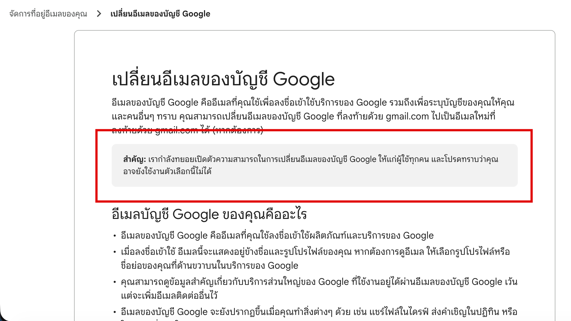 ในหน้า Support ของทาง Google มีการระบุว่า “การเปลี่ยนอีเมลของบัญชี Google” กำลังจะทยอยเปิดให้ใช้งานสำหรับผู้ใช้ทุก ๆ คน ซึ่งในตอนนี้อาจจะไม่ใช่ทุกคนที่สามารถเปลี่ยนชื่ออีเมลได้ทันที