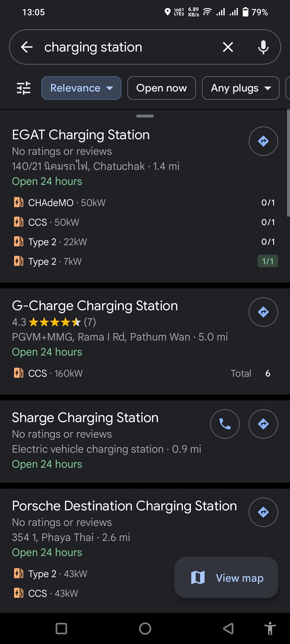นอกจากนี้ยังมีฟีเจอร์สำหรับค้นหาสถานีชาร์จรถยนต์ไฟฟ้า ซึ่งสามารถตั้ง Filter ตามประเภทปลั๊กที่ใช้ได้ รวมถึงมีบอกความแรงของระบบชาร์จด้วย