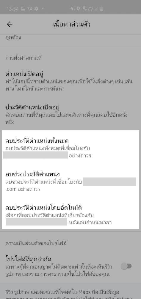 Settings (การตั้งค่า) > Personal Content (เนื้อหาส่วนตัว) > Delete Location History Range (ลบประวัติตำแหน่งตามช่วงเวลา) หรือจะตั้งเวลาลบอัตโนมัติก็ได้นะ