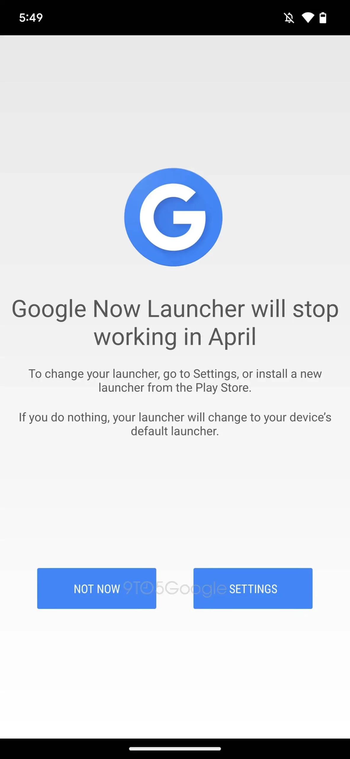 ในแอป Google Beta v14.14 เวอร์ชั่นล่าสุดได้มีข้อความแจ้งเตือนผู้ใช้งาน Now Launcher ว่าตัวแอปจะถูกปิดอย่างถาวรภายในสิ้นเดือนเมษายนปีนี้ พร้อมลงรายละเอียดว่าถ้าหากใช้ Launcher ตัวนี้อยู่ ก็จะถูกเปลี่ยนเป็น Launcher ค่าเริ่มต้นที่ถูกติดตั้งมากับตัวเครื่อง พร้อมแนะนำให้เปลี่ยนไปใช้งานตัวอื่นแทน