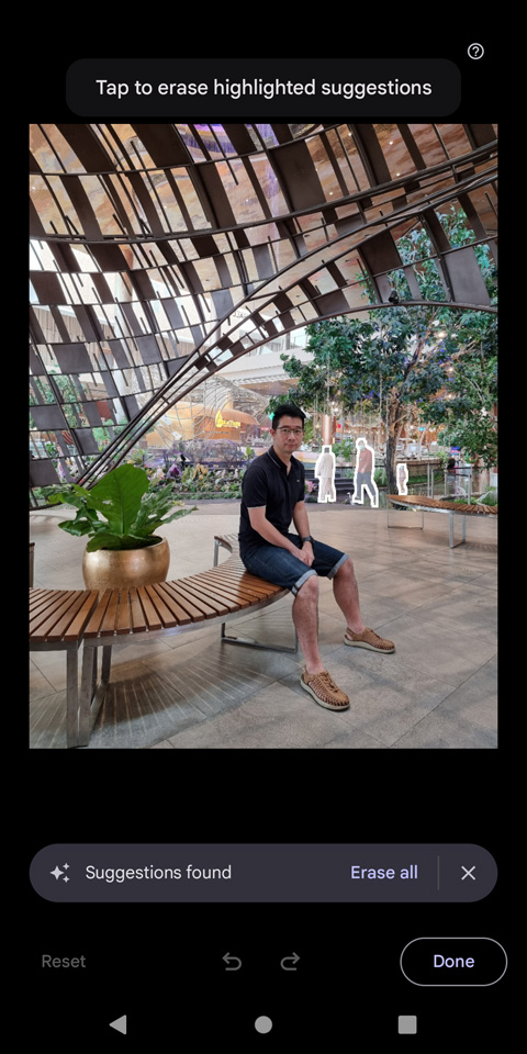- ระบบจะแนะนำวัถตุที่ควรจะลบออกจากภาพให้โดยอัตโนมัติ หรือสามารถใช้นิ้วลากครอบวัถตุที่ต้องการเองได้
