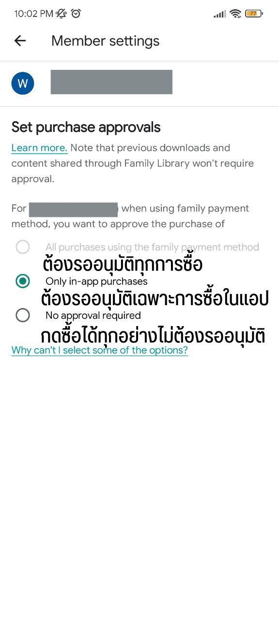 จากนั้นกด Purchase Approvals > เลือกระดับอนุมัติการซื้อของ โดยมีระดับดังนี้ (1) ต้องรออนุมัติทุกการซื้อ (2) ต้องรออนุมัติเฉพาะการซื้อในแอป (3) กดซื้อได้ทุกอย่างไม่ต้องรออนุมัติซึ่งถ้าไม่ใช่สมาชิกที่ตั้งค่าว่าเป็นลูกใน Family Link จะปรับได้แค่ 2 ระดับล่างครับ