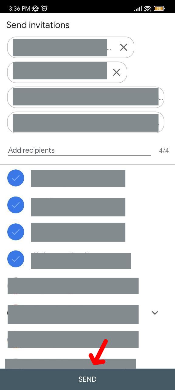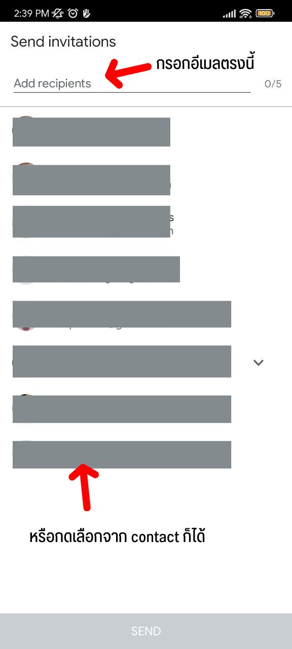 พอกดเสร็จแล้วก็จะพามาหน้าเพิ่มสมาชิก กด continue > กดเลือกว่าจะชวนใคร จาก contact หรือจะพิมพ์อีเมล์ใส่ก็ได้ > กด Send เพื่อส่งคำเชิญ
