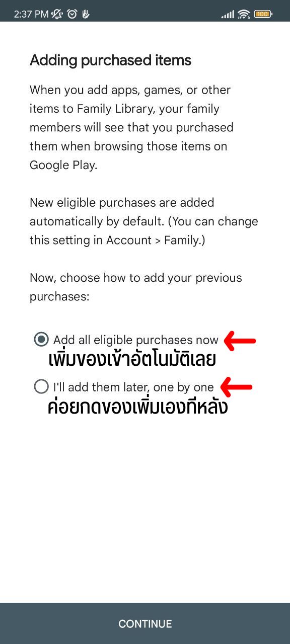 แล้วเราก็จะมาถึงหน้าให้เพิ่มของเข้า Family Library กด continue > กดเลือกได้ว่าจะใส่ของที่เคยซื้อมาอัตโนมัติเลย หรือจะกดเพิ่มเข้าเอาทีหลัง