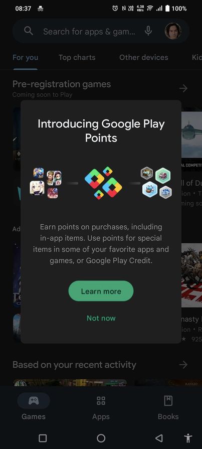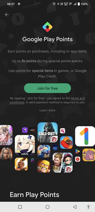 ถ้าใครต้องการใช้ระบบ Google Play Points ก่อนอื่นก็ต้องเข้าไปกด Join ซะก่อนใน Google Play Store นะครับ หากว่าของใครที่สามารถใช้ระบบนี้ได้แล้ว เมื่อเข้ามาครั้งแรกจะเจอกับหน้าต่างแนะนำระบบดังกล่าว ก็ให้เรากด Learn more จากนั้นก็กด Join for free เพื่อเริ่มใช้ได้เลย