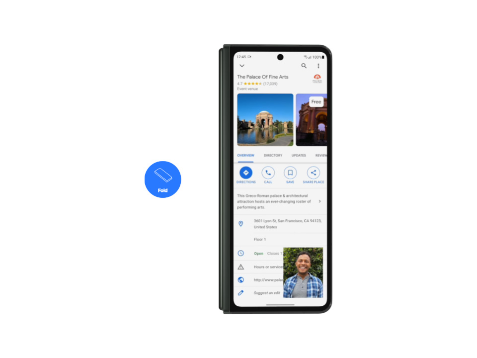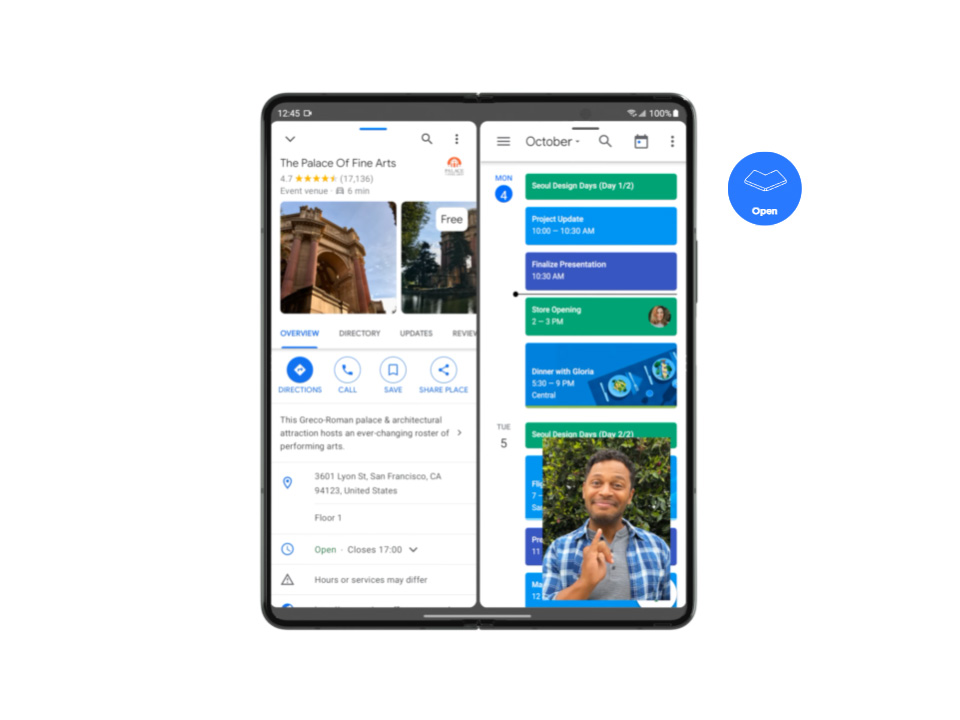 - Work – แสดงให้เห็นถึงการทำงานที่ต่อเนื่องของ Maps อย่างราบรื่นจากหน้าจอด้านนอกสู่หน้าจอด้านใน รวมถึงสัดส่วนและอินเทอร์เฟซของแอปที่ถูกออกแบบให้เหมาะสมกับมือถือจอพับ จากนั้นต่อด้วยการแบ่งหน้าจ่ออย่างรวดเร็วผ่าน Edge panels เพียงแค่แตะค้างที่ Calendar หรือแอปอื่น ๆ ที่ต้องการ แล้วลากไปวางยังตำแหน่งที่ต้องการ