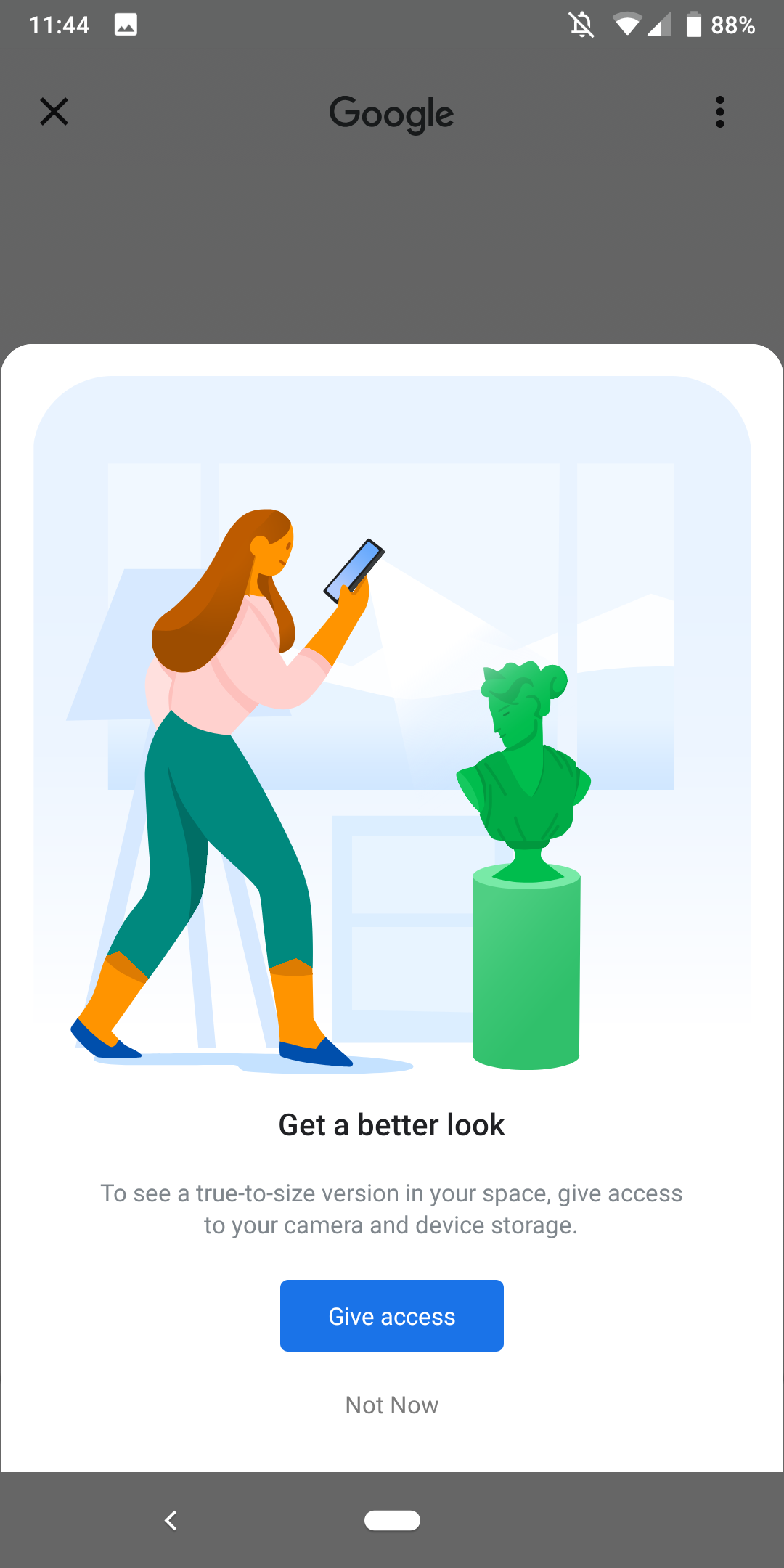แต่ถ้าอยากดูเสือในรูปแบบเสมือนจริง ให้กดที่ข้อความ “View in your space.” หากเราเริ่มใช้งานระบบนี้ครั้งแรก มันก็จะเด้งหน้า “Get a better look.” ขึ้นมา จากนั้นเราก็ต้องเปิดให้ระบบเข้าถึงกล้องและหน่วยความจำของเราโดยกดตอบรับ “Give access” เพื่อเริ่มใช้งาน