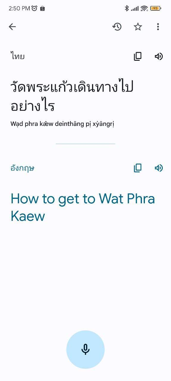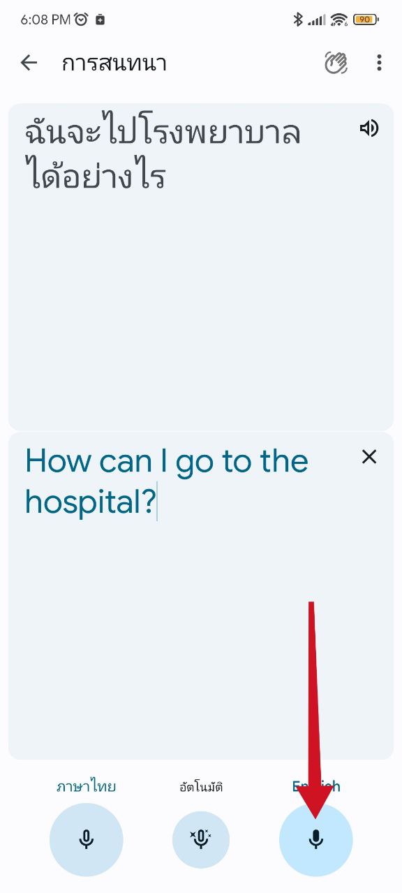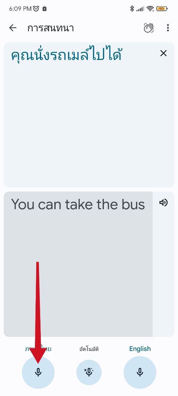เข้าแอป Google Translate > เลือกภาษาต้นฉบับด้านซ้าย และภาษาที่ต้องการบทแปลด้านขวา > กดปุ่มไมค์ตรงกลางแล้วพูด