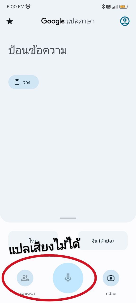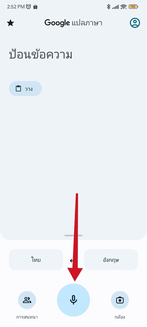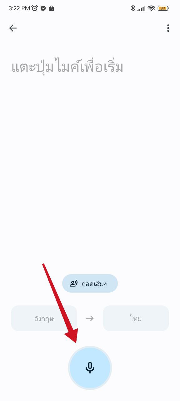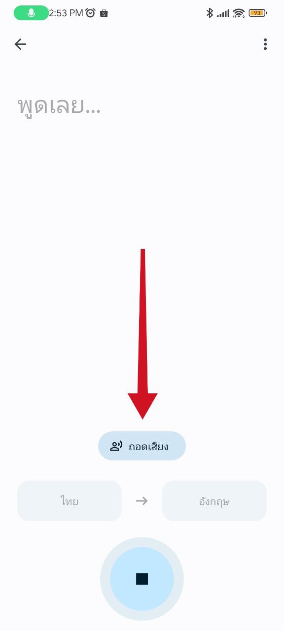 เข้าแอป Google Translate แล้ว กดปุ่มไมค์ > กดปุ่ม ถอดเสียง
