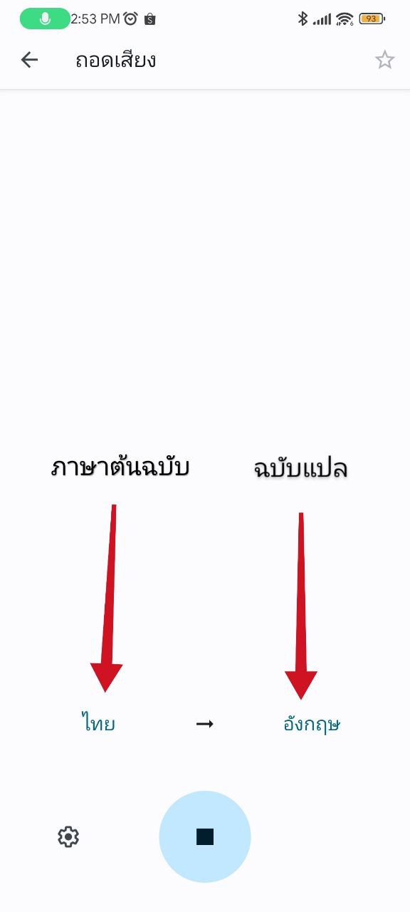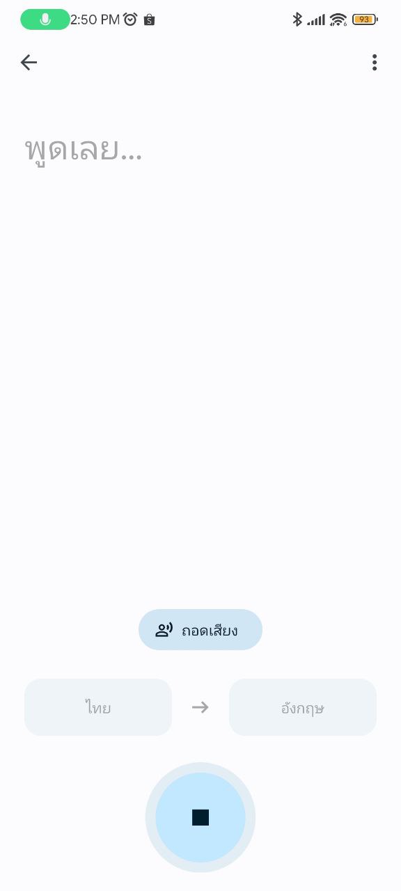 หน้าตาระหว่างการใช้งานก็จะออกมาประมาณนี้ คือจะไม่มีขึ้นตัวหนังสือภาษาต้นฉบับ แต่จะโชว์เฉพาะการแปลออกมา โดยแอปจะจับเสียงและแปลไปเรื่อย ๆ จนกว่าเราจะกดหยุดครับ