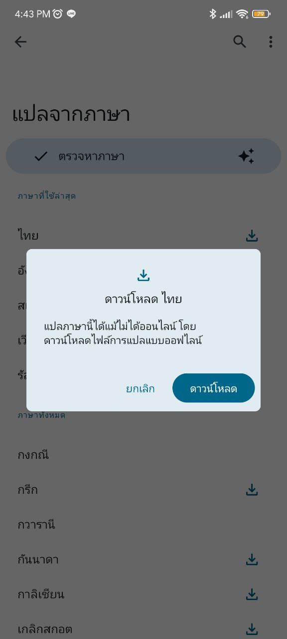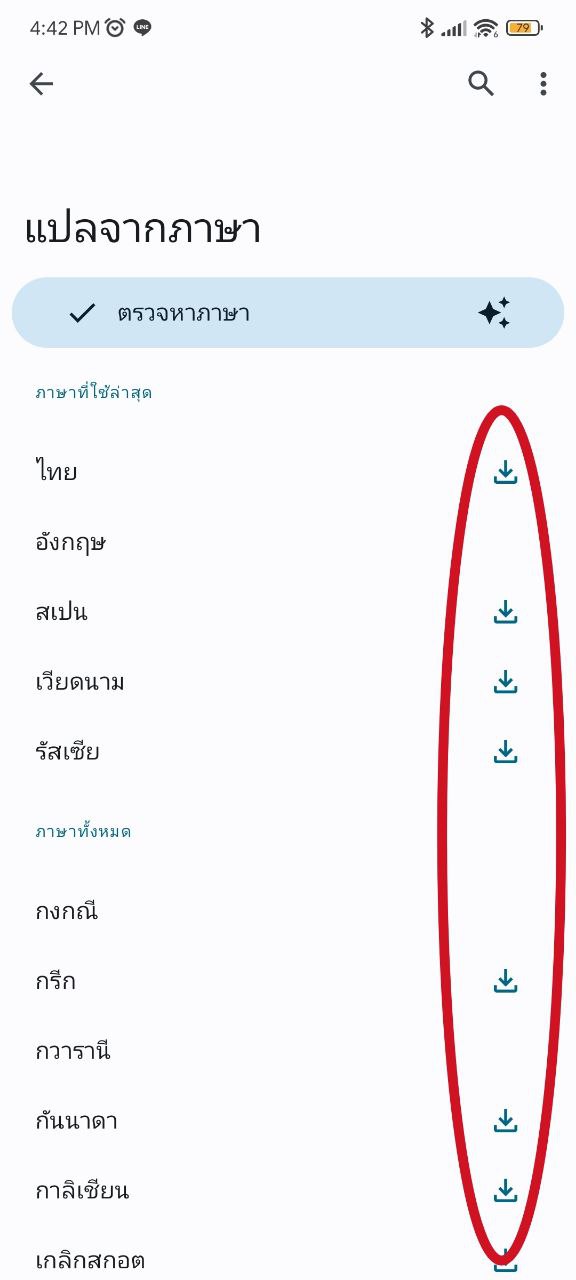 เข้าแอป กูเกิลแปลภาษา แล้วกดตัวเลือกภาษา > เลื่อนหาภาษาที่ต้องการข้อมูล แล้วกดปุ่มดาวน์โหลด ด้านขวา > ยืนยันการดาวน์โหลด