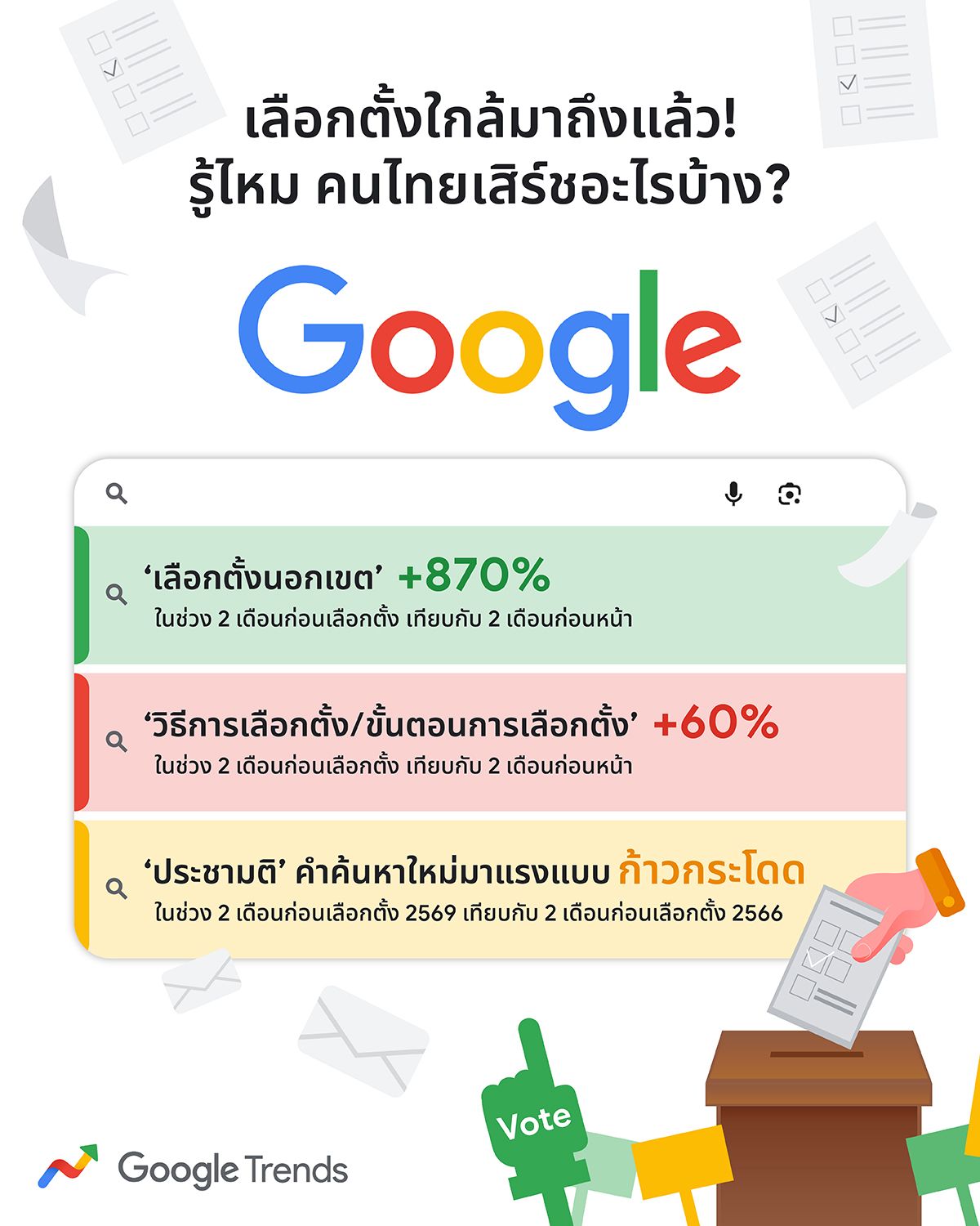 เข้าใกล้วันเลือกตั้ง 2569 แล้ว Google Trends สรุปข้อมูลคนไทยค้นหาอะไรบ้างบน Google ในช่วง 2 เดือนก่อนเลือกตั้ง โดยเฉพาะคำว่า ‘ประชามติ’ ซึ่งเป็นคำที่มาแรงที่สุดสำหรับการเลือกตั้งในปีนี้