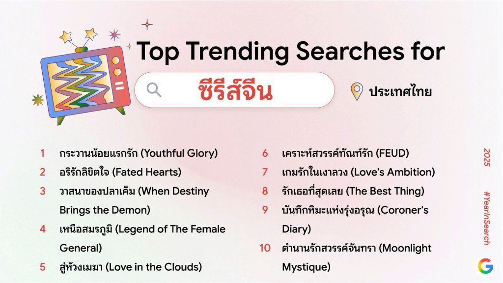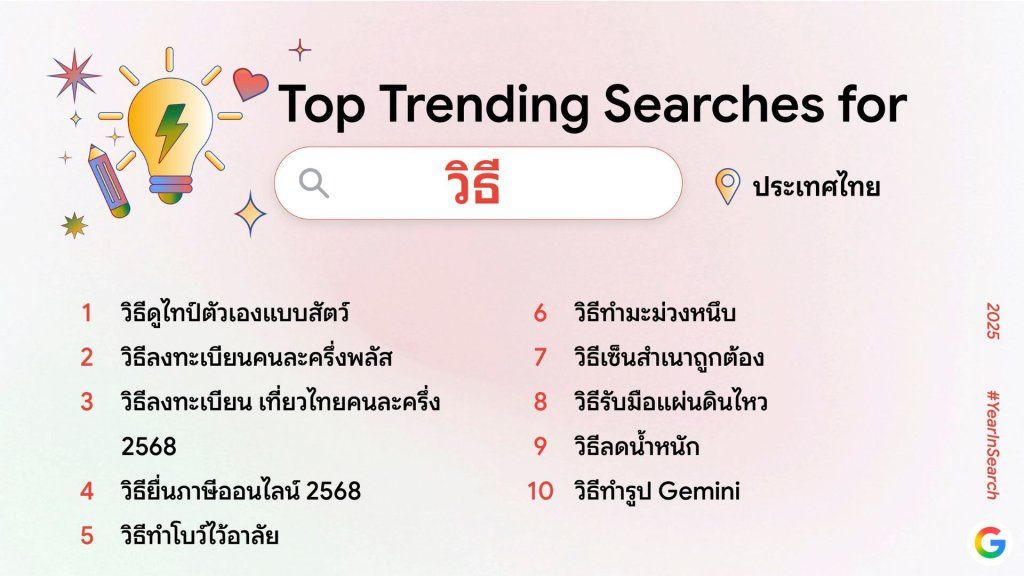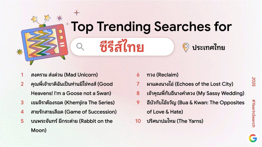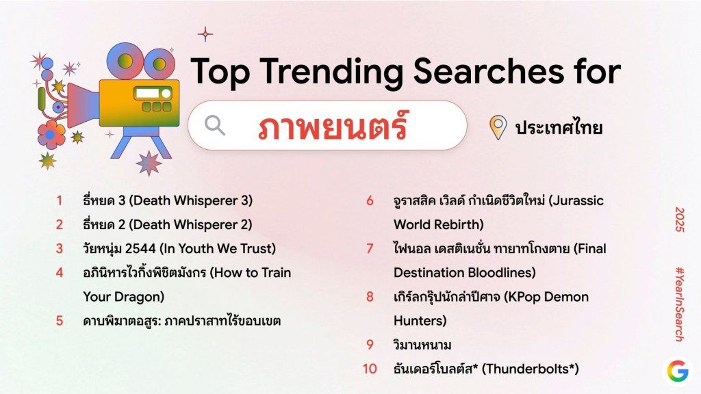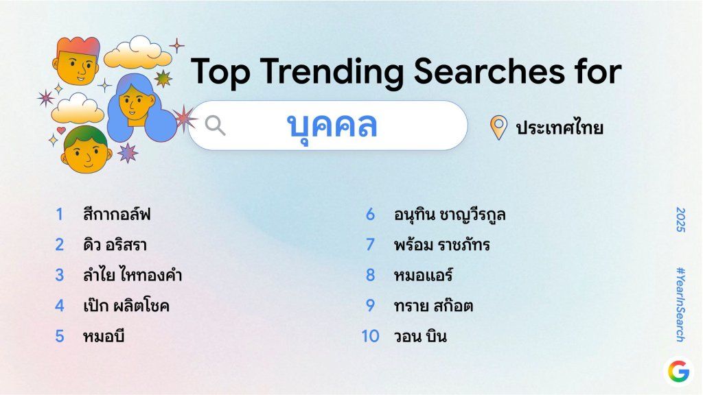 Google ประเทศไทย เปิดเผยผลการค้นหาของคนไทย หรือ ‘Year in Search 2025’ ออกมาเป็นที่เรียบร้อยแล้ว โดยคำค้นหานี้แทบจะเรียกได้ว่าเป็นภาพรวมของความสนใจของคนไทยในปีนี้ ได้เลยทีเดียว โดยลิสต์ที่เปิดเผยออกมาจะมีคำที่ทุกคนเคยค้นหาไปด้วยหรือเปล่า ? เราไปชมคำค้นหายอดนิยมของชาวไทยในแต่ละหัวข้อกันเลย